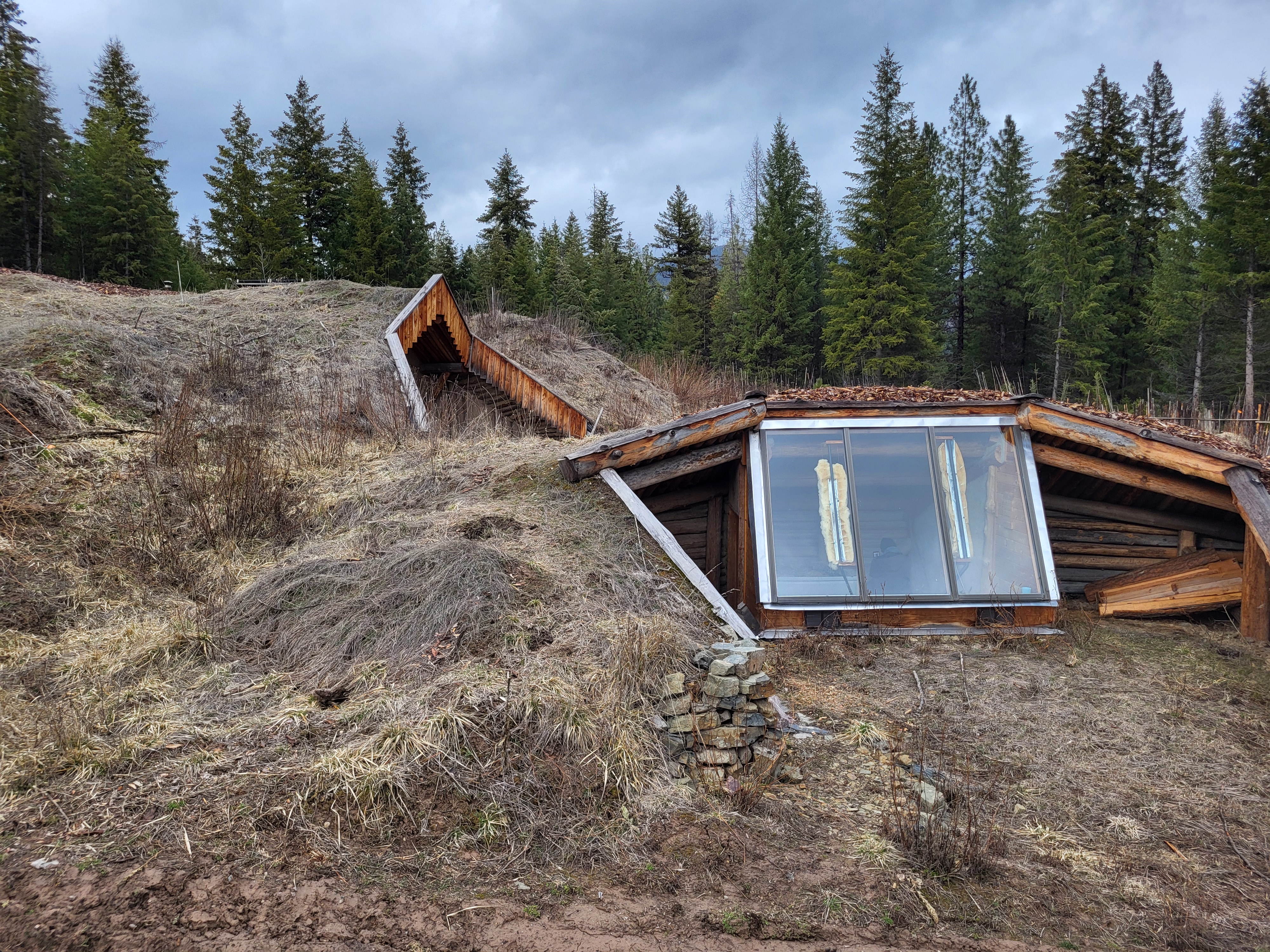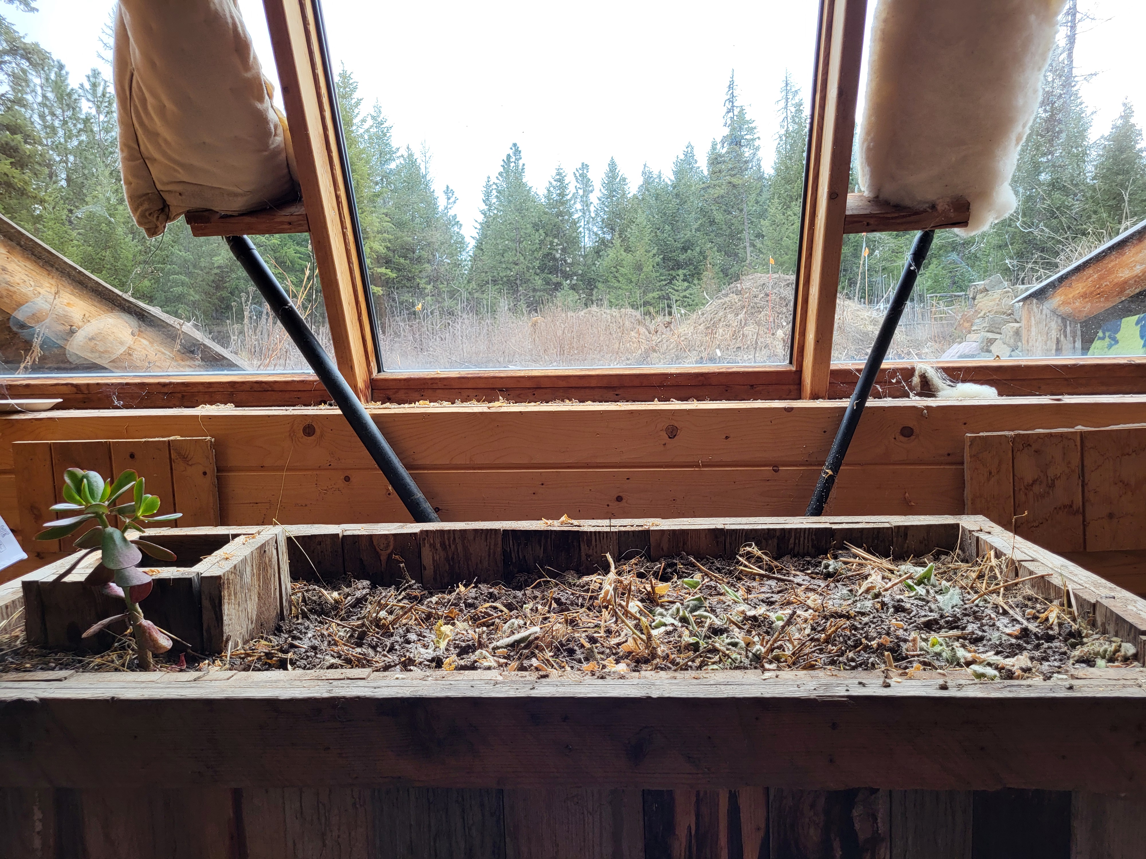 ) would be: repairing cob on the front wall that is a result of setting in the structure, repair/replace cracked front window, place wood in the cracked portion of the earthen floor to bring to the same level and finish the cob floors to that fix and the fix to the threshold, fix a crack in the rear wall cobbed/plastered wall, unbind and repair the hinges to prevent further binding of the back door, run simple electrical circuit/wiring to a couple of outlets convenient spots in the Abbey and get reattached to the solar panels on the "roof" and update/include charge controller/inverter/battery setup, consider plumbing for water and include/complete grey water system integrating with the greenhouse/collection for winter months, replace some rotting planks on the front porch, get new wool felt sealing material on the front door and new lower jamb, adjust the current retention approach for the "cover" of the rocket stove to ensure that the cover stays on without additional "support" (logs used to help hold the cast iron "cover" on). That is the list I can recall tonight, but I can think through if there is anything else after visiting again this weekend.