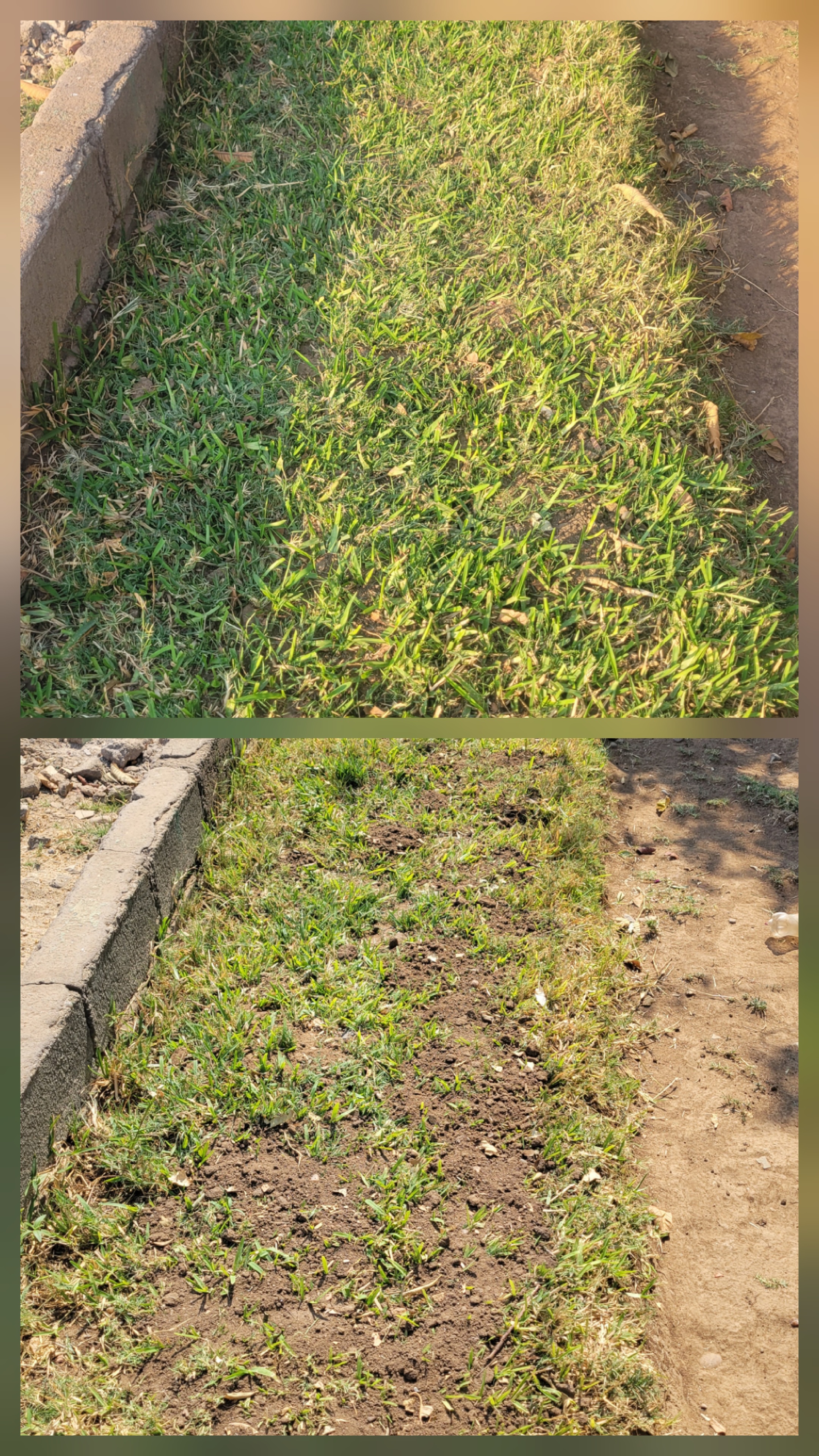 I once mentioned how I am using waste from our dogs, where I take one year old decomposed dog poo, and bury it at the bottom of the keyhole garden. This was better in my mind than dumping the waste outside our yard or leaving it for the garbage collectors who will dump it at a dump site near other people's homes. But at the back of my mind, I still felt uncomfortable putting the waste in my garden. I am happy to say I found a new system for the dog waste. I will still be throwing it in pits that I dug inside our yard, and I use leaves or whatever is available to absorb any stench. When one pit is full, I use the second one and wait for a year before I take the decomposed poo from the first pit. Now, I am spreading it on our small lawn patch. The patch is surrounded by blocks that are quite high, meaning it's going to take years before I can fill up the lawn patch with the decomposed waste. It's been a few weeks since I started working on the lawn, and already, it's greener than before, and this is in the dry season. I am so glad that I am responsible for the chain of the dog poo waste, where it's not polluting the environment in any shape or form at any stage.