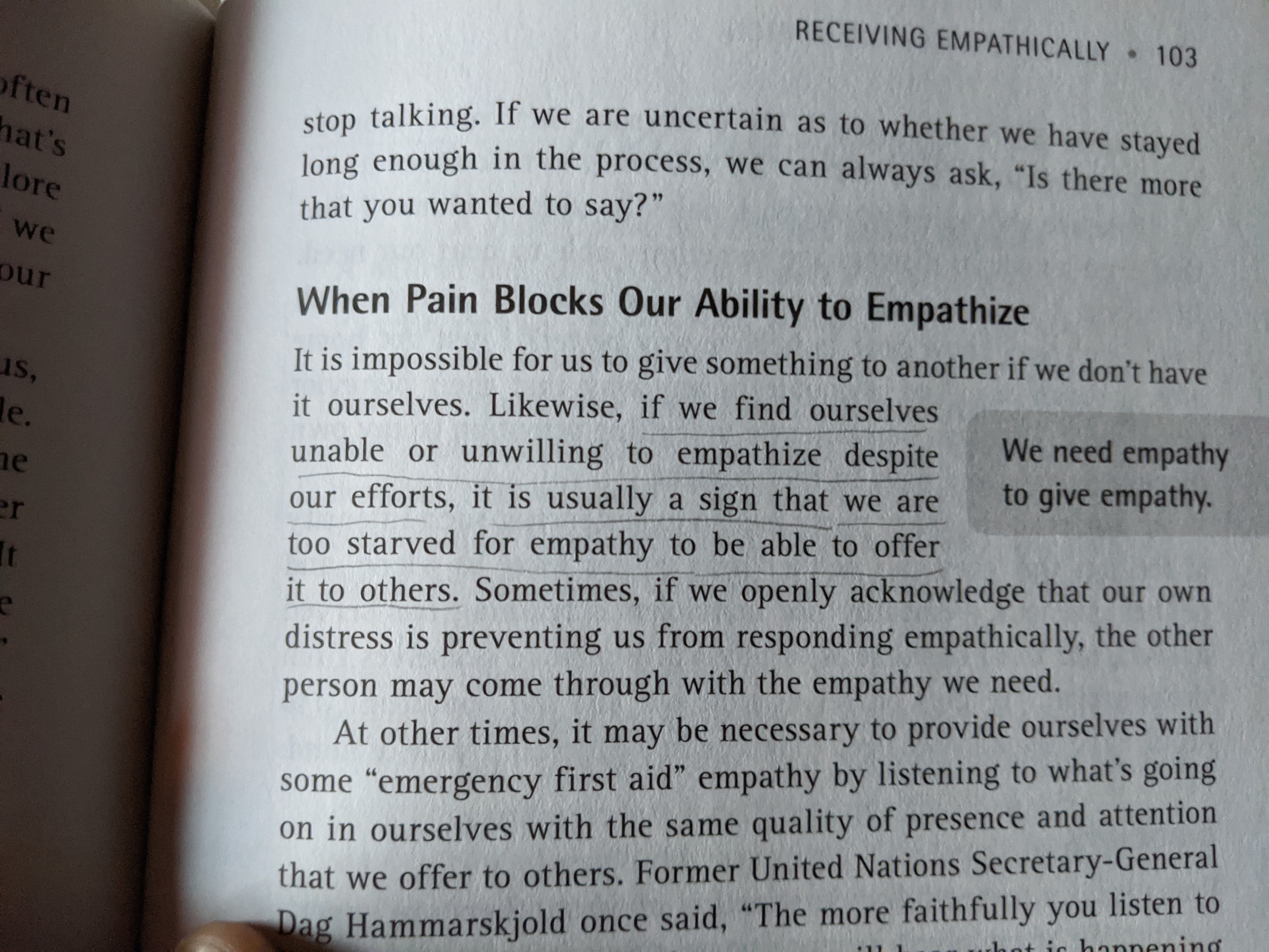 I've been binge reading permie related things lately, but also just started a book called Nonviolent Communication: A Language of Life. I'm not the best communicator at times, and I know I need to improve. The title says nonviolent, which refers to having compassionate communication. One of the topics he discusses at length is about empathy. The passage in the picture below resounded with me because I occasionally find myself looping on something that has bothered me. It struck me that I loop because I haven't found the empathetic ear that I'm searching for to relieve myself of these troubles. I get placated, commiseration, or worse yet shut down, but the root still exists. Gotta figure out how to ask for what I need. 🤔