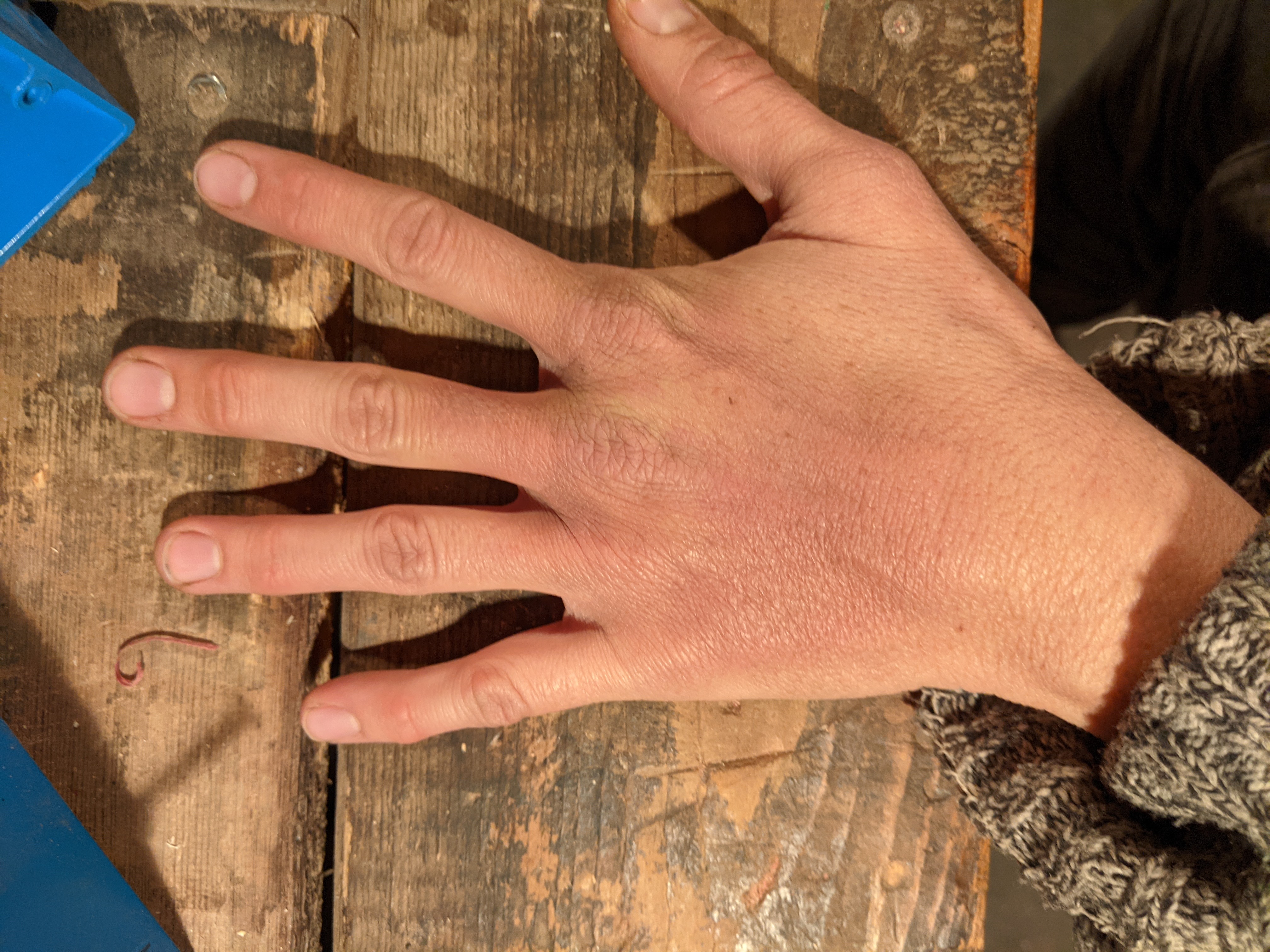 My hand ached all night and into the morning. New barometer? Turning all sorts of fun colors still. Hurts to even try to put it in my pants pocket or tuck my sweater into my overalls. Really anytime I brush anything against the back of my hand it feels like a knife slicing through it. Never realized how much I put my hands in my pockets until now. Doesn't help that we've got a cold snap. Today felt kinda bitterly cold. Kept trying to hide my hands from the cold. Pulling my favorite leather gloves over my hand is a tender process right now, so I've been wearing my insulated mechanics gloves since they're a little roomier. The fingertips don't fit as well though, so I haven't been as happy about doing the detail work in them as I might be in my leathers. Need to sew up one of the fingertips in my right leather glove because that's becoming too big to stay useful for much longer.