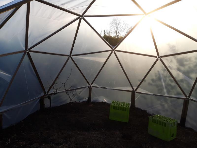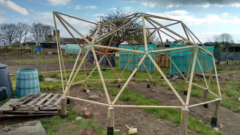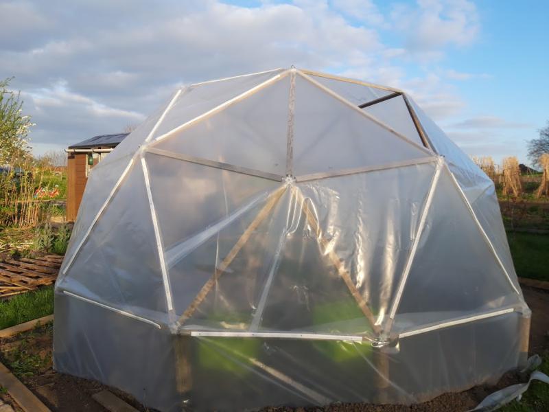 If this version doesn't survive I'll probably just put an actual polytunnel up! I have a greenhouses at home (one a glass and aluminium, one super-insulated double glazed)- the geodesic is at my allotment which makes things much harder to build as the ground isn't level and there's no electricity or car access, and there's restrictions on what you can do and when you can be there.