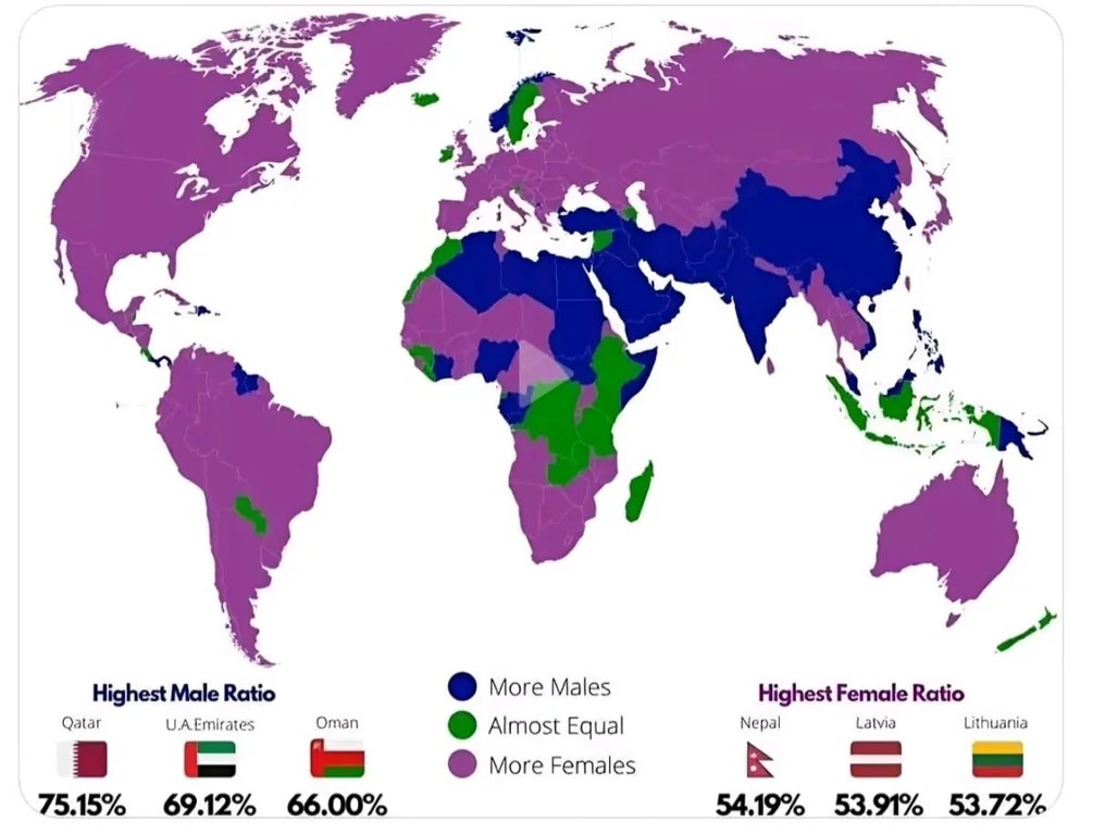 highest male countries were high by 15 to 25% and were all on the edge of the Persian Gulf - maybe men move there for the jobs, and women are likely not appreciated?