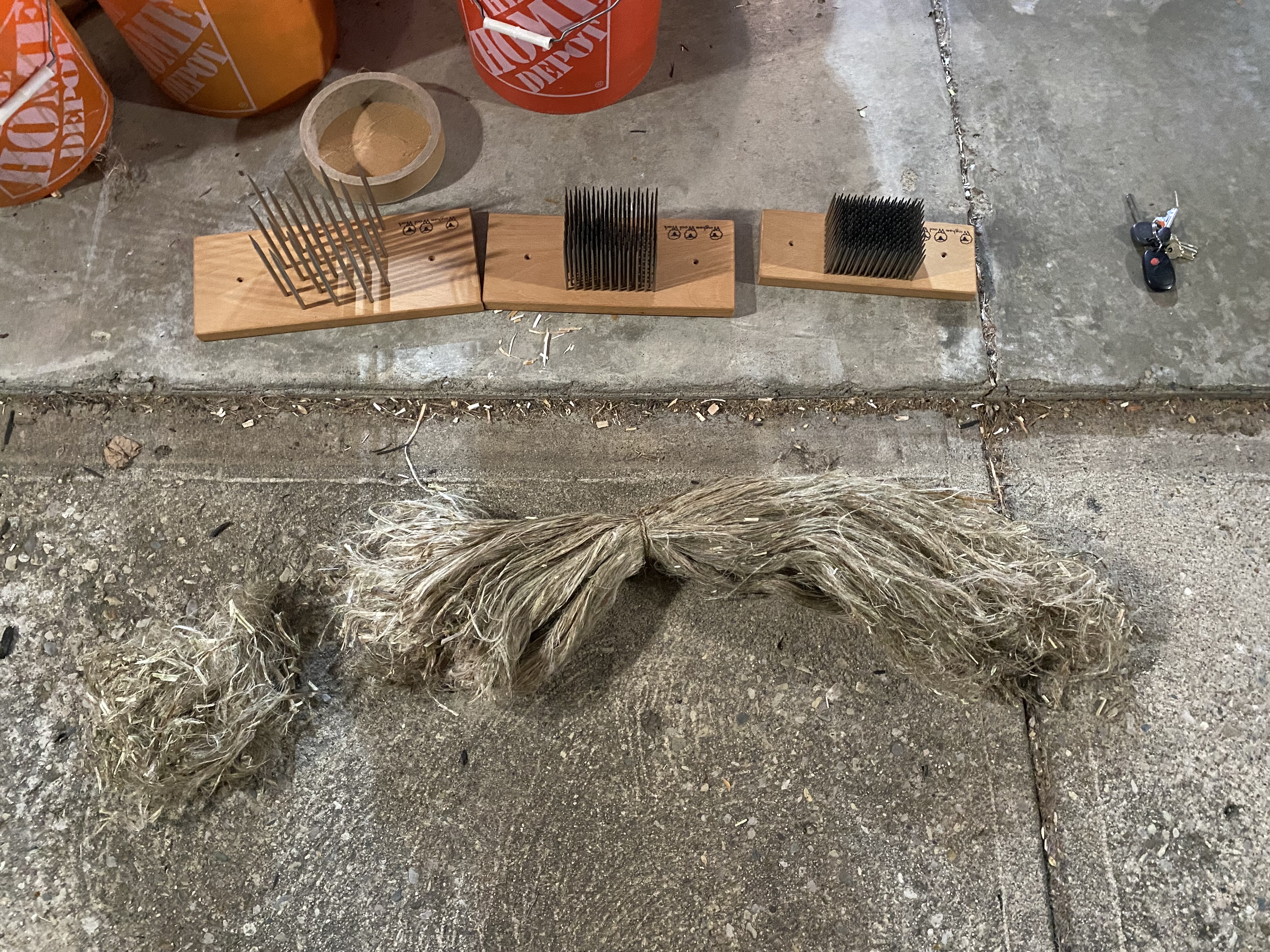 Ryan M Miller wrote:As of yesterday, I have finished retting, braking, scutching and hackling the nettle fiber. The total fiber yield was 7.9 ounces. Of that, 1.2 ounces was long line fiber; 2.2 ounces was long tow fiber; 2.1 ounces was medium length tow prepared into combed top; and the remaining 2.4 ounces was short tow fiber still yet to be drum carded. The yield of long line and long tow for this wood nettle was significantly smaller by percentage than the yield of long fiber from my adam's needle yucca leaves earlier this year (43% long tow and long line fiber from the nettle as opposed to 67% long line and long tow fiber from the yucca). I'm wondering if this is due to the nettle fibers being weaker than the yucca fibers, the stem nodes creating weak points in the nettle fiber, or just due to me under-retting the fibers.