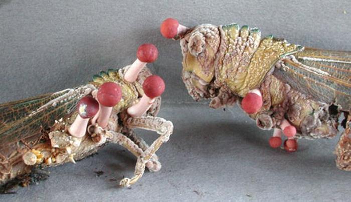 Cordyceps fruiting bodies sticking out of them? Apparently there are some 400 species of these bug-eating parasitic mushrooms -- and I get the notion that there are many more uncatalogued ones. Yes, these are the "zombie-making funguses" that sometimes seem to "steer" their victims to some high place where the spores will get better distribution. Here's some stunning video of the process: