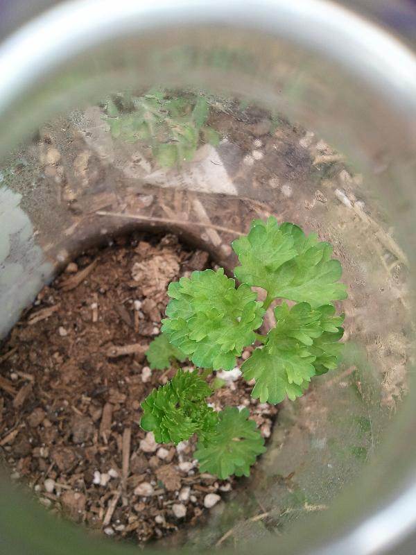 This last one is curly leafed and pretty. Familiar somehow but I can't place It. Its currently thriving under a soda bottle dome where I recently put Tomato & Basil. I know its not either of those.