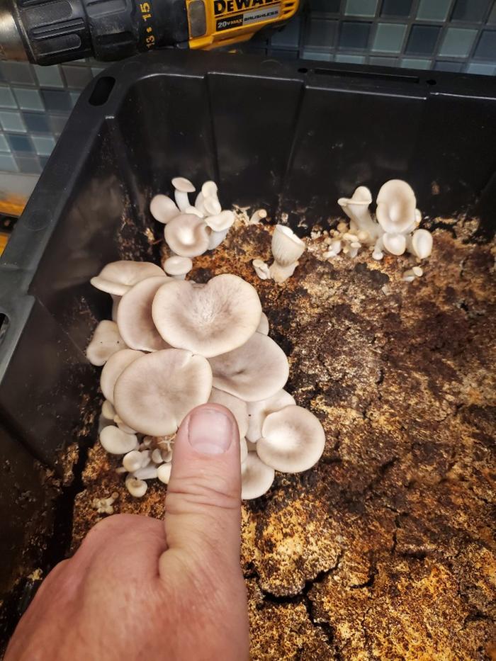 Wayne,wayne fajkus wrote:That first flush fizzled. I was out of town for a week so i put it in the dark. Got back, and a few days later, looks like i will be cooking mushrooms tonight. Thumb for size reference....