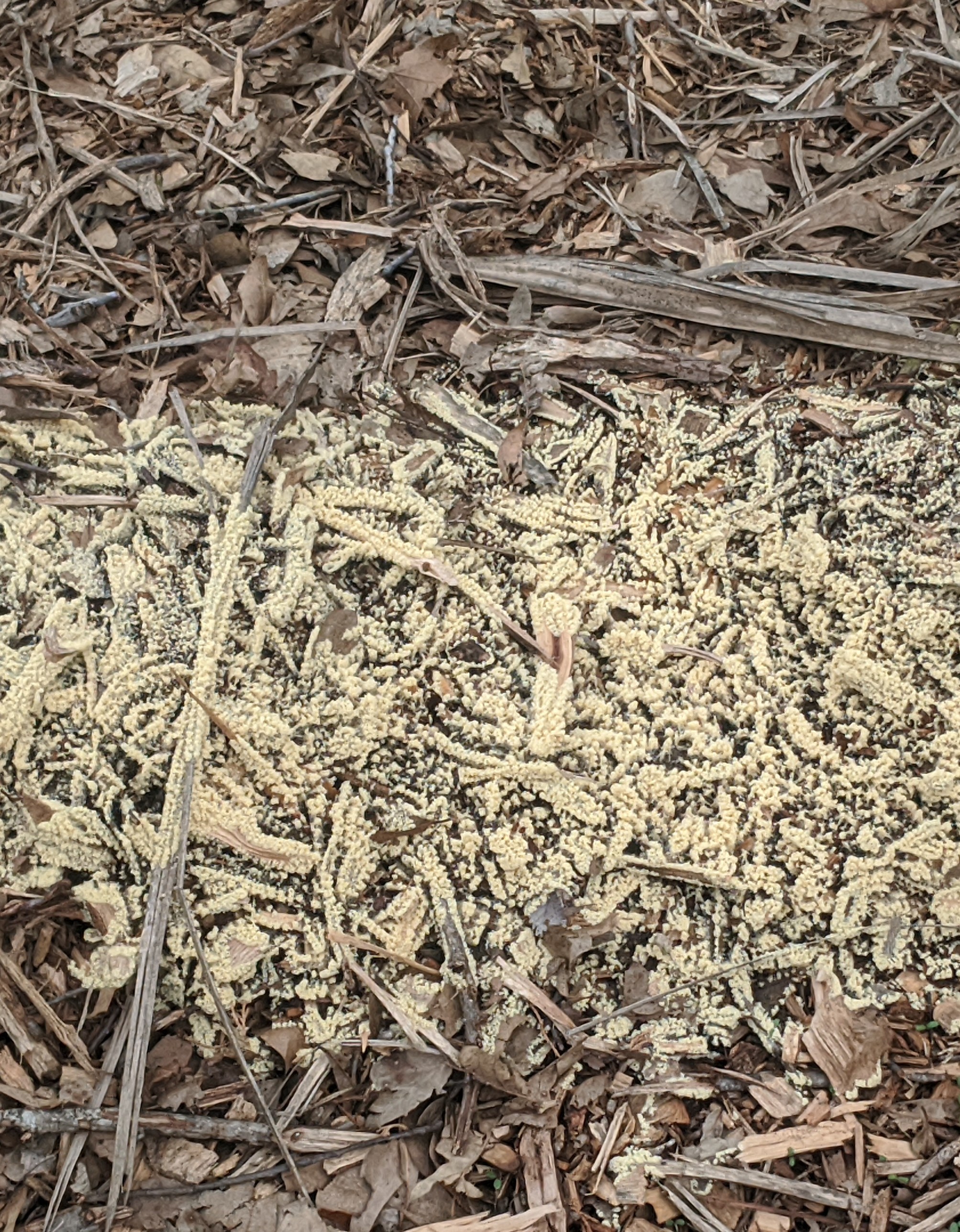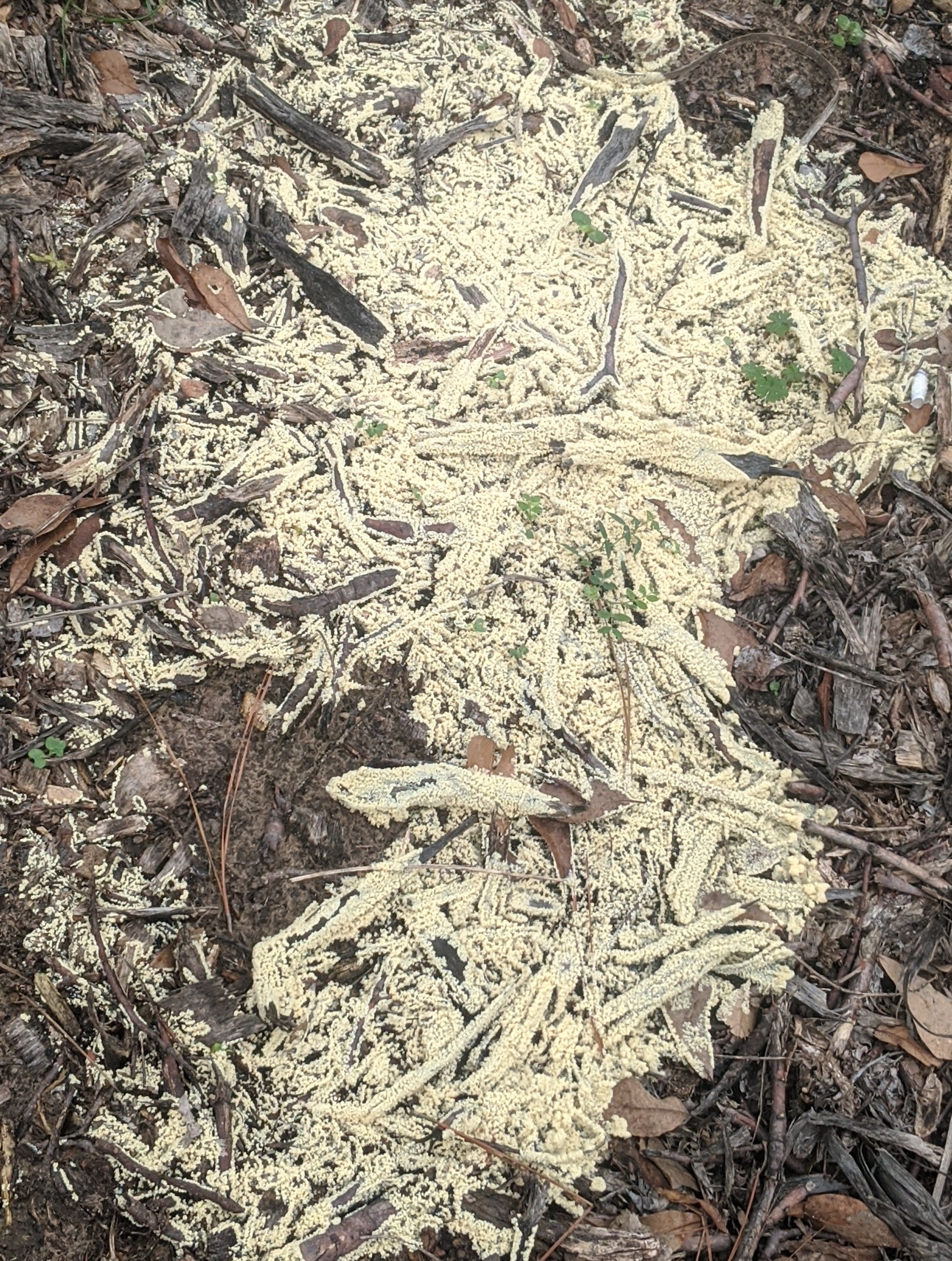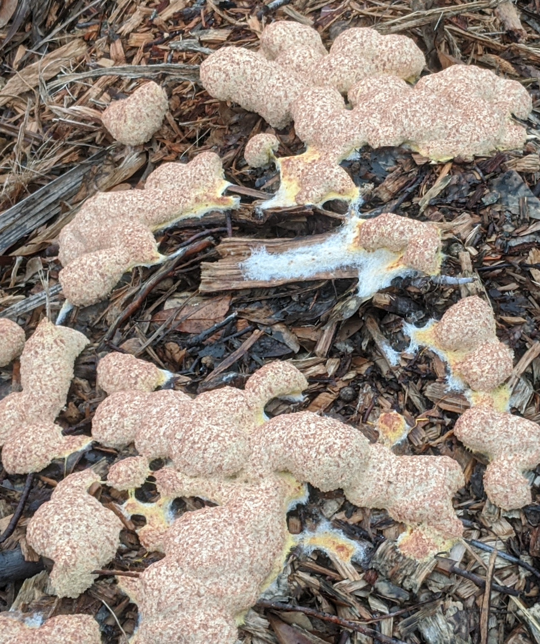 The Dog Vomit slime mold, is one of the various forms of these organisms, each species has particular color and texture, generally there is no concern since you can do a simple swipe over it and it will deflate and retreat.