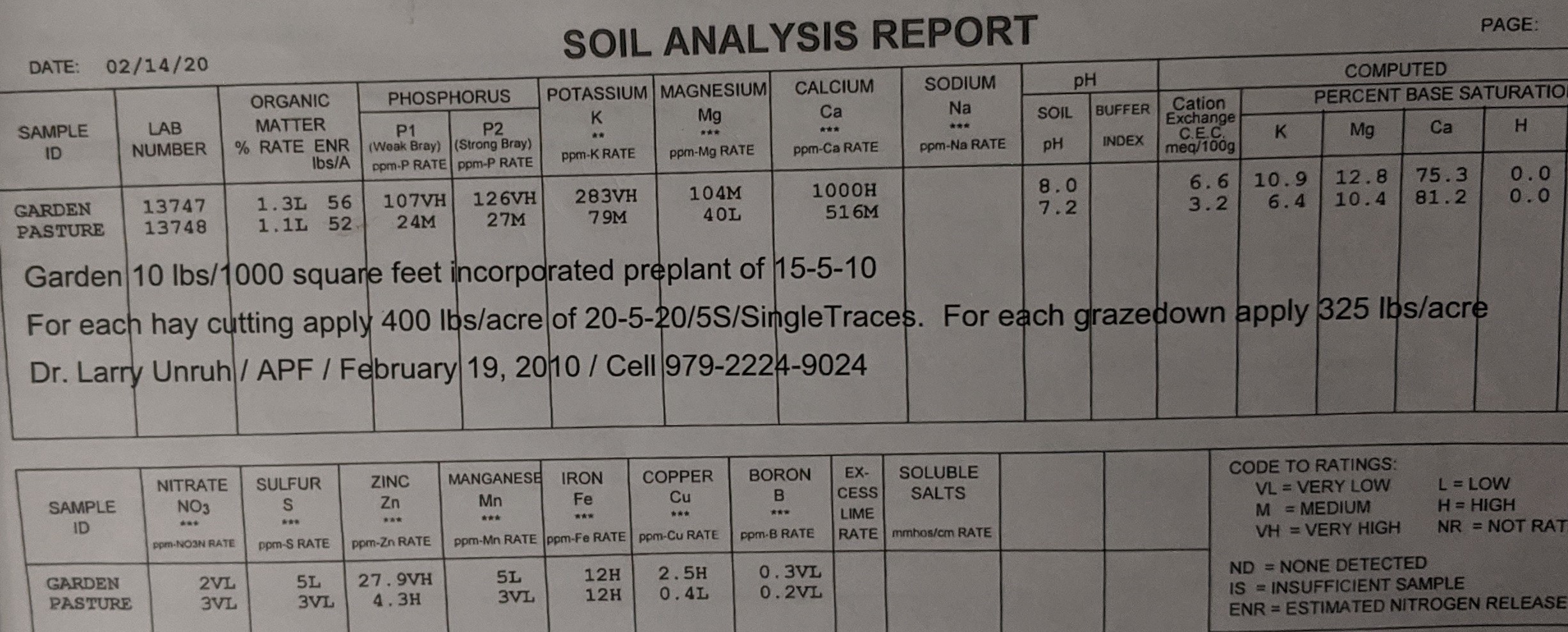 I sent in a soil test a few weeks ago to get an idea of what I'm working with, and how to better plan for future soil building, since I've only been working on this part of the property for about a year. Actually, I sent 2 samples, with the "garden" being the area I've actively worked on, and the "pasture" as a comparison since it hasn't had anything done except for being shredded a few times over the year. While I understand the report, I'm not sure what to do with the info (using permie methods).