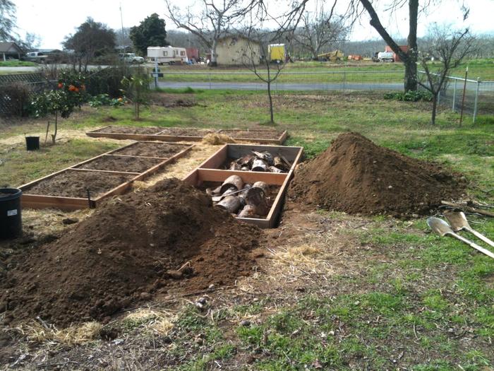Beds #1 and 2: Conventional 4'x14' frames made of one-by-twelves with half-inch hardware cloth to keep out the gophers. Almost as an after thought I threw some branches under these beds, approximately 60 liner feet of 2-inch diameter, mostly English walnut. I figure that I will refer to these two beds as traditional raised beds with a slight nod to hugelkultur. My experience (organic gardening in Northern California) has been that without the wire gophers will show up half way through the season and wipe out all their favorite veggies in a couple of days, then gradually munch their way through the others.