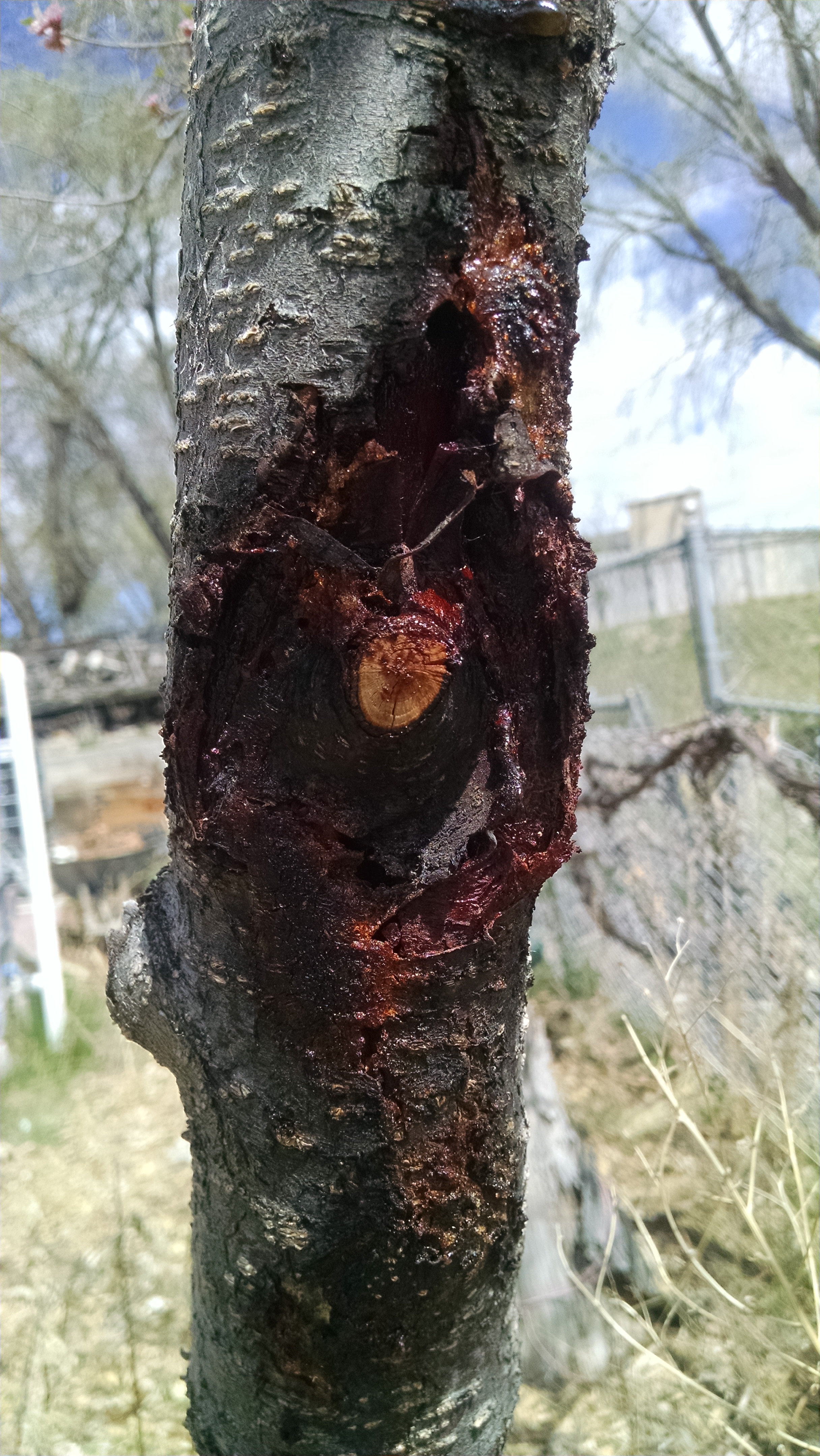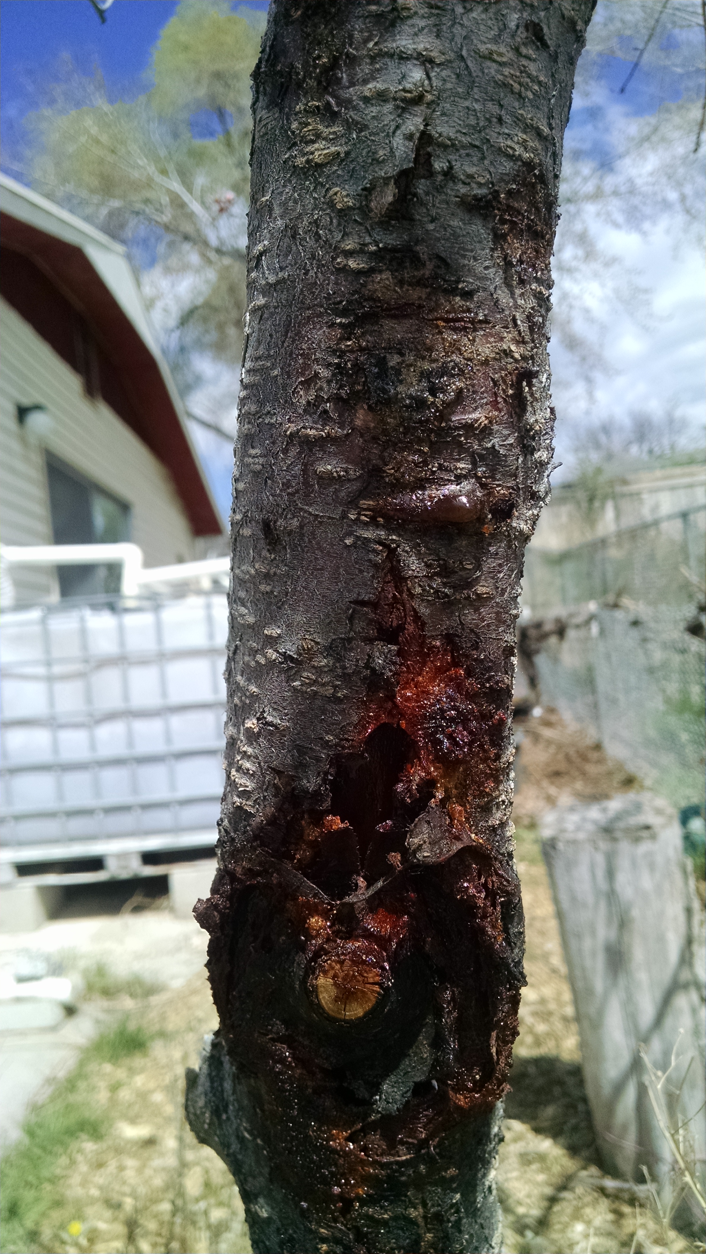 This problem wasn't there last week when I checked the tree. Any idea what we're dealing with? The tree is already weakened and I expected that it would die this past winter. Instead it's loaded with blossoms. Can I save it?