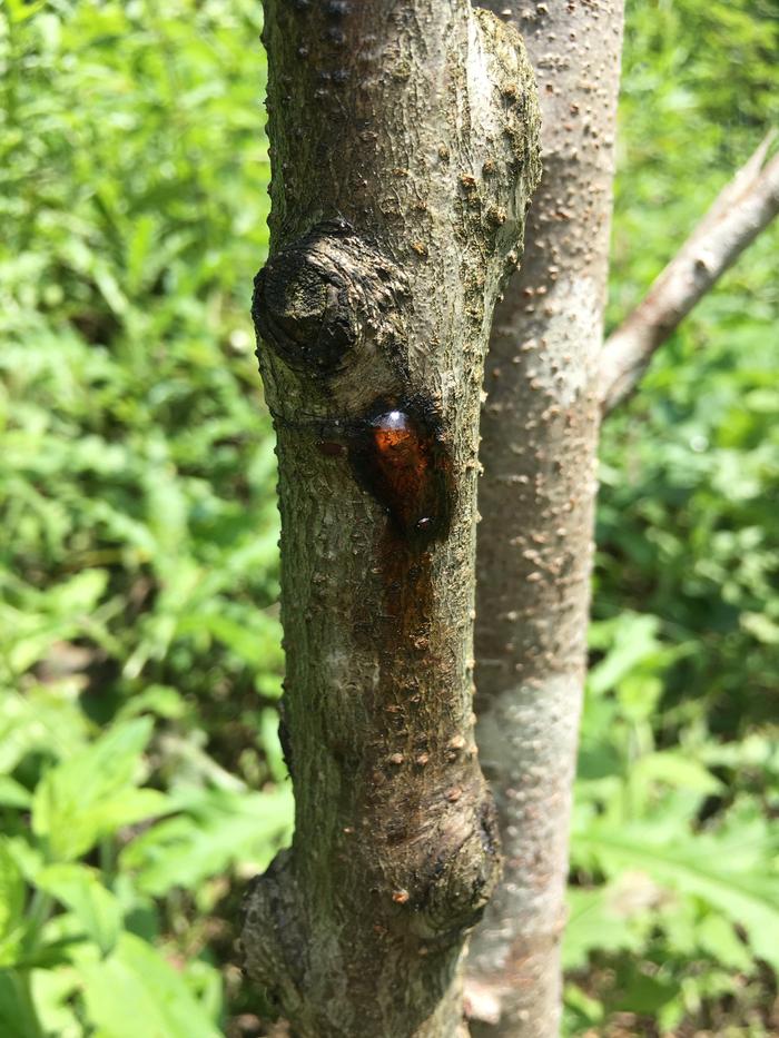 I’ve planted a peach tree (Selvatico di Rosegafero, which is a local and ancient, resistant peach variety) in early spring this year. It survived a serious drought this spring (as due to the Covid lockdown I wasn’t allowed to visit the property to water the trees), which was great! I bought this tree from a sale as it was the last tree from the stock and not the nicest of specimen, so I wasn’t confident the tree would survive. Nevertheless it seems to have survived the drought with flying colours, and even has 3 peaches growing healthily even though the tree only has one branch. But now last time I checked the tree I’m noticing several spots on the tree that have sticky sap on them. I haven’t spotted any insects on the tree (although there are anthills nearby), and I didn’t damage the tree myself as far as I’m aware.