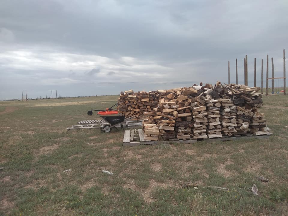 The big metal building behind him is where we move the wood in the winter. He has it sitting out right now to be dried by our very serious winds. Dries wood out very fast.
