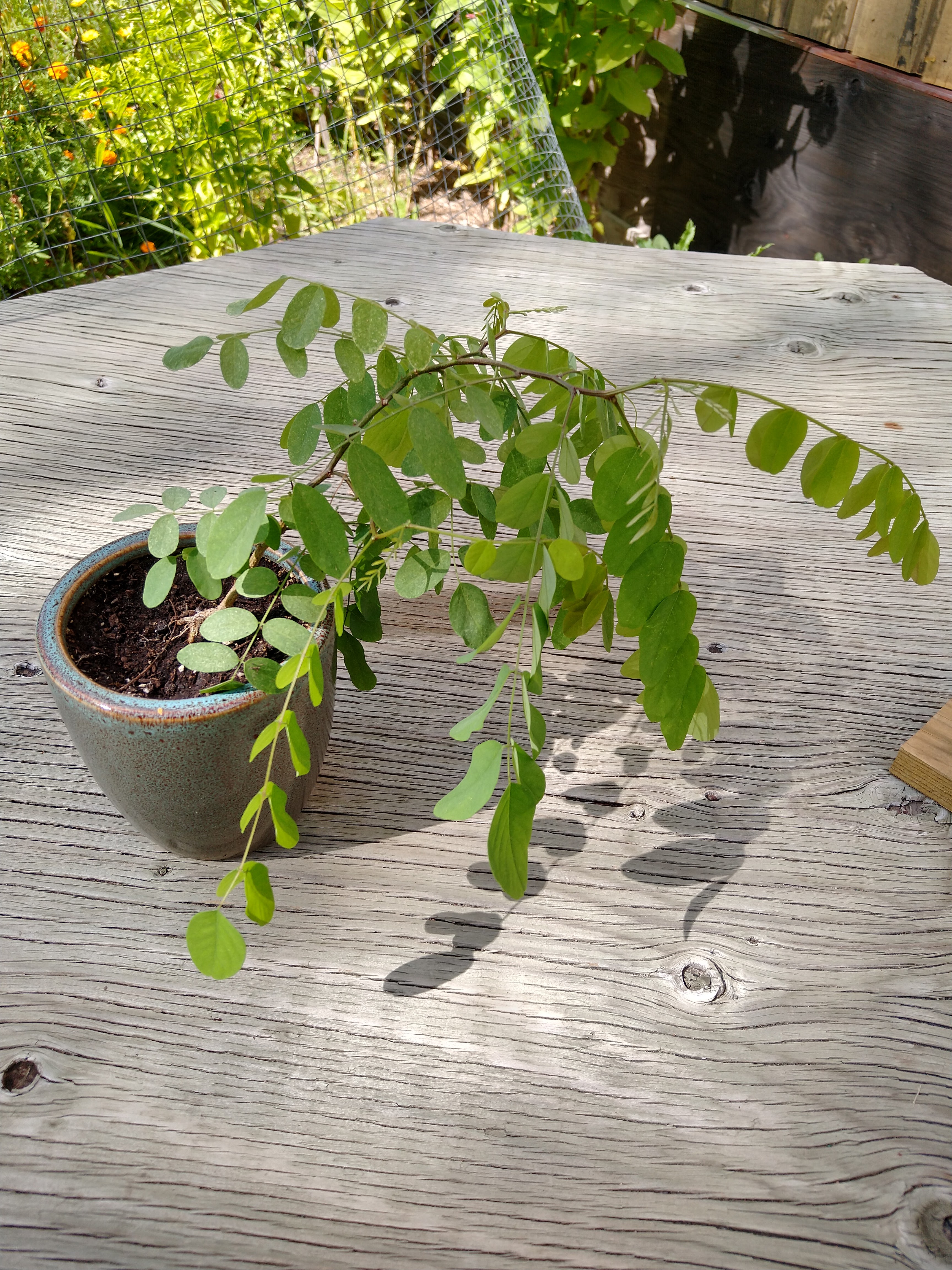 I have one black locust (BL) seedling that germinated this spring and is in a smallish pot about 4" diameter right now. The tree is about 12" tall.