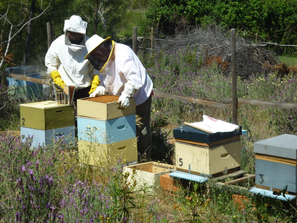 That tall bee-hive has wild comb in the bottom segment and, hopefully, lots of babies in the green segment above it. Those two segments are 'brood chambers' where the queen can lay her eggs.