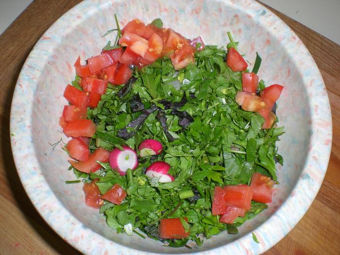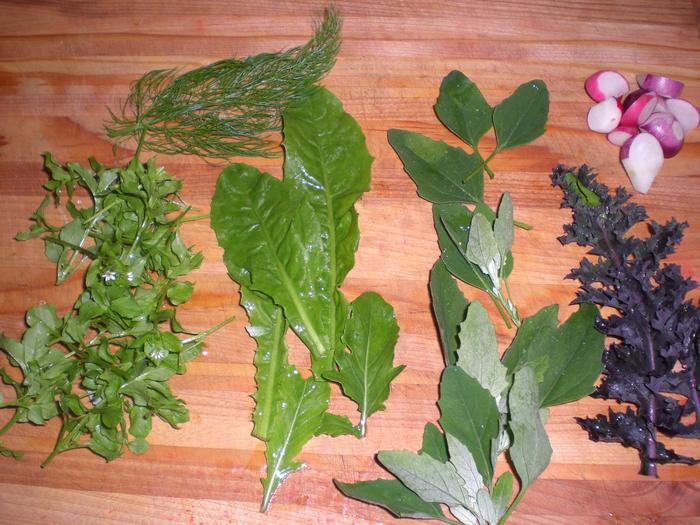 since my lettuce is mostly slug bait, I replace it with Chickweed, baby dandelion greens, lambs quarters, accented with fennel, purple kale and some teeny radishes , arugala and tomatoes. Of course with any salad ingredients and dressing choices are unlimited