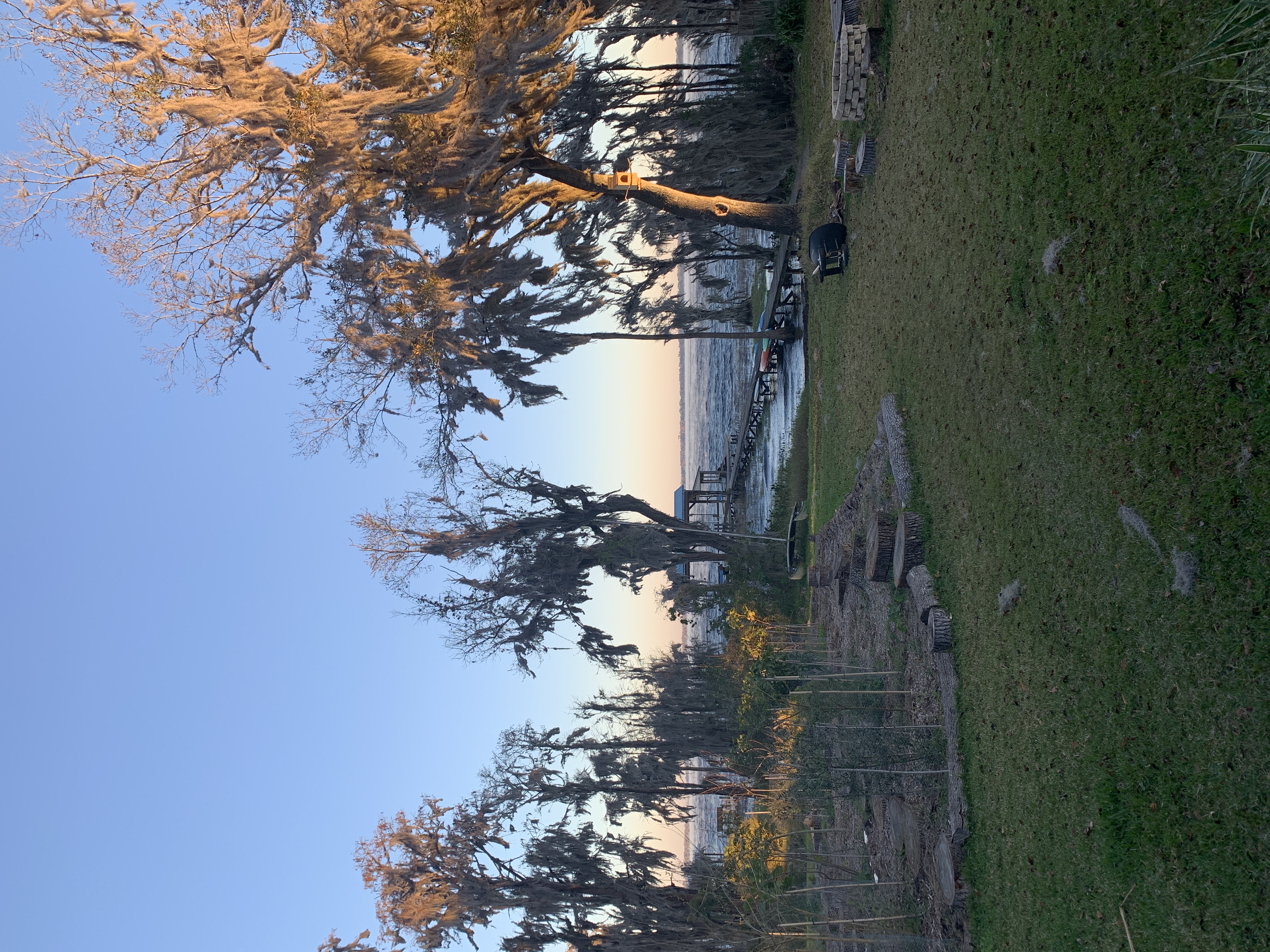 It is about an acre on the lake bordered by a house that is rarely occupied on one side and a wild area we lovingly call "the jungle" that is about a ten foot high bramble area of a significant amount of beautiful elderberry, grape vines, shampoo ginger, and blackberries. This jungle runs the length of the eastern property line and is adjacent to the chicken coop area. I allowed our flock to forage in that wild area with the safety from birds of prey thanks to the canopy. Our front yard has one area sodded with Bermuda grass to serve as the "lawn" and the remainder of the front yard is mulched and planted heavily in food forest fashion to shade out and block continued grass growth. In the front I have planted moringa, edible hibiscus, false roselle, sugar cane, chaya, Jerusalem Artichoke, loquat, avocadoes, persimmons, pears, guavas, bamboo, pomegranate, bananas, turmeric, pineapples, mango, sapote, katuk, ginger, figs, taro, loofah, and there is an existing established pindo palm, and one old citrus tree. I won't get into what herbs and pollinator attractor plants are in the front. I also have a substantial passionfruit tunnel that I intend on rebuilding once the vines die down with some cold weather. We have a significant heat shelter with the deep and broad lake Santa Fe in our backyard so that helps to dampen the impact of the coldest north Florida nights. The backyard has our official food forest that includes all trees and a lot of mulch and soil fertility building material. The plants in the back are more sugar cane, star fruit, olives, mulberries, cherry of the Rio Grande, jaboticaba, mango, katuk, pawpaw, peach, nectarine, pear, apple, fig, Guanacaste, false roselle, papaya, pineapples, passionfruit, goji berry, Chinese honey oranges, sweet potatoes, and some logs that were fruiting with oyster mushrooms. Everything was planted within the past three years so many of these trees are still in the "sleep" phase of plant growth in Florida. A neighbor informed me that plants in Florida sleep, creep, and eventually leap. Some things already produce a fair amount like the figs and mulberries. There is still a large amount of grass and a wild riparian zone along the lake. I am happy to answer your questions and I know I have already shared more information than you were asking to get!