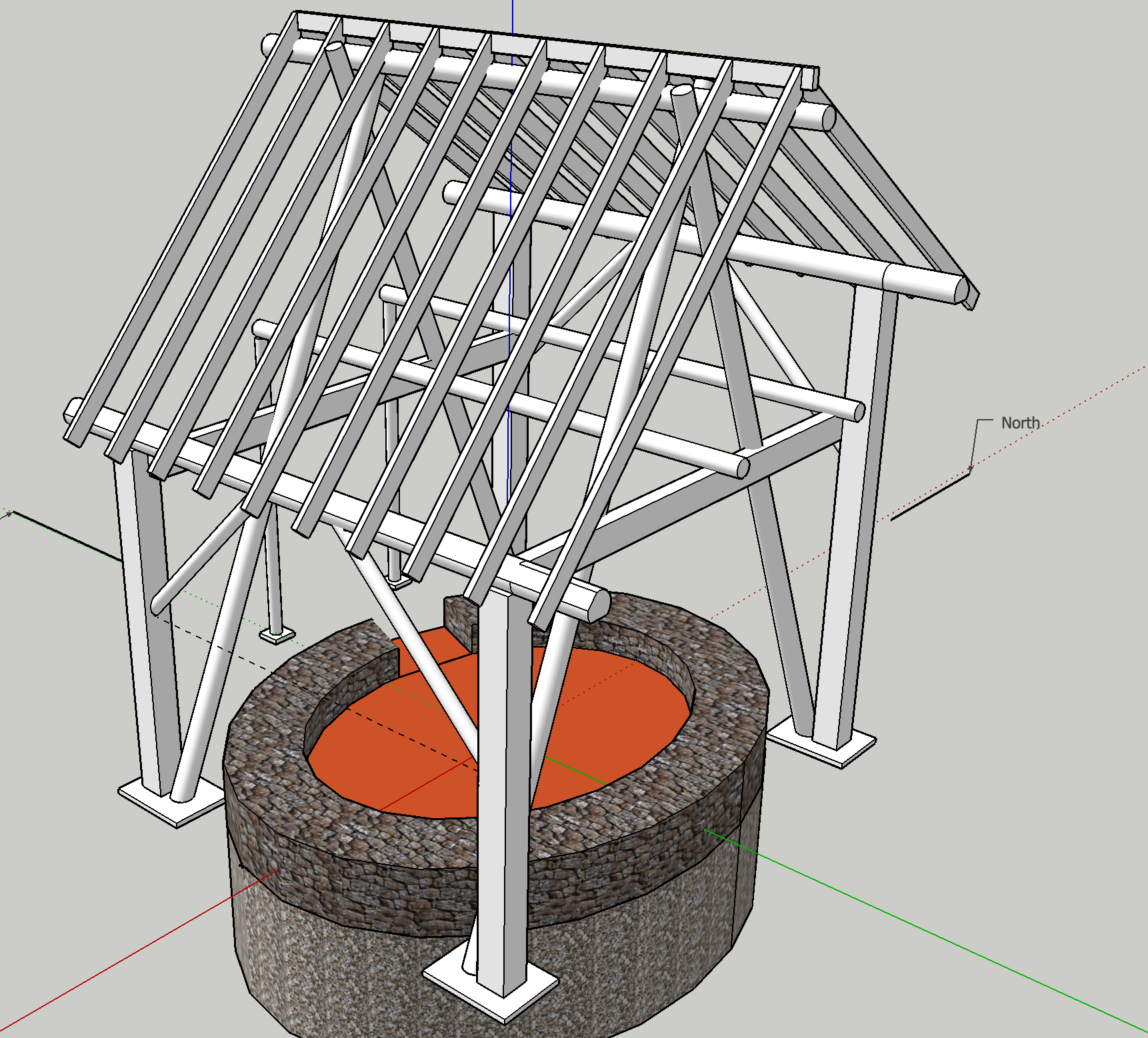 You can see on my sketch some arrows, those are meant to indicate the direction of the force. In order to have an integral structure, make sure that each force from above coming from the weight of the structure, will have a clear path downwards, and will have the correct counterforce. In this case I've annotated the main diagonal beams - make sure they have a counterforce at the base(burrying the beams to a decent depth might do the trick though pay attention to rot!) and with the triangles formed between the diagonal, vertical and horizontal beams, make them fixed onto eachother.