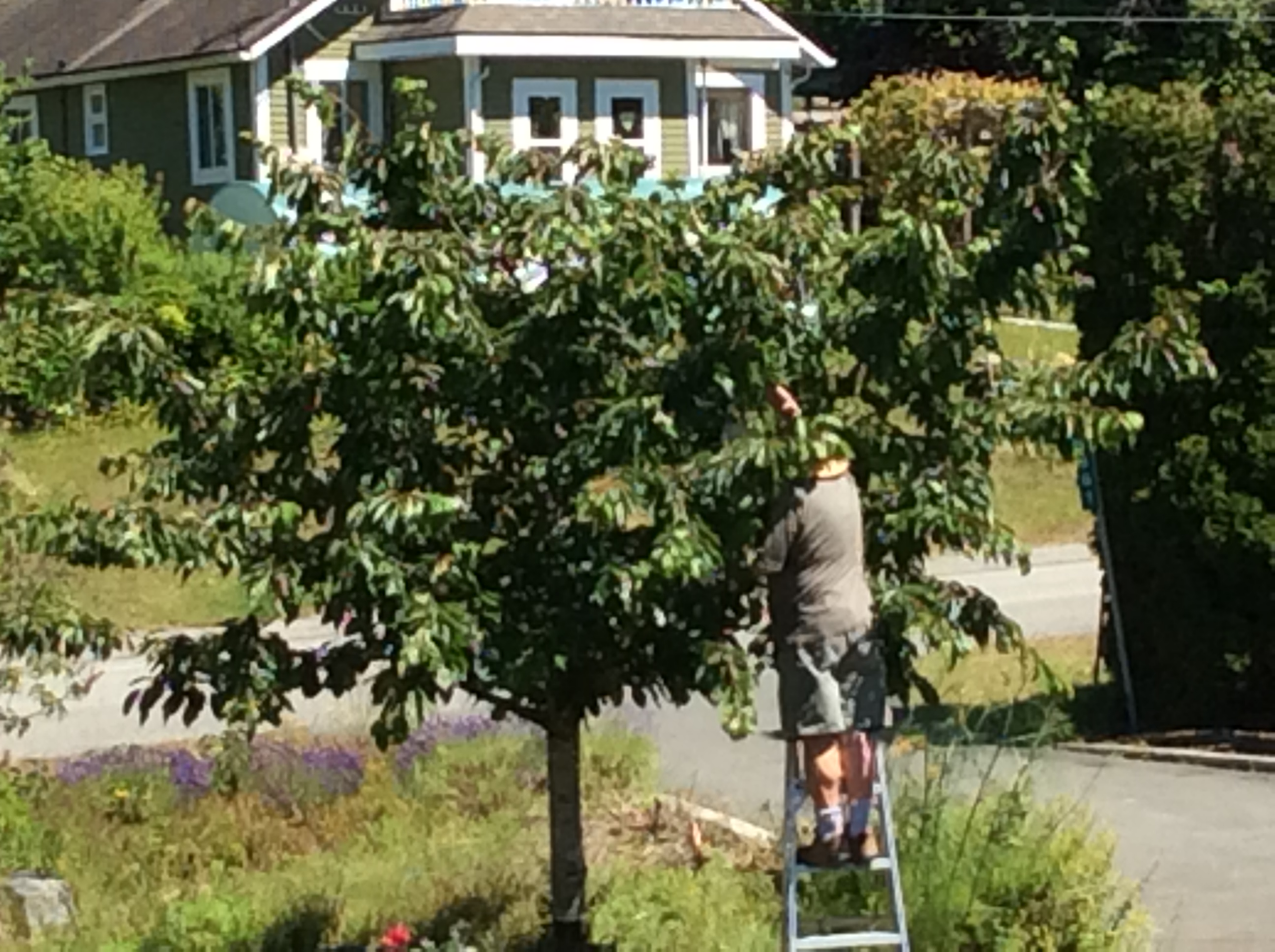 The tree , a dwarf Stella cherry, is about 12 years old now. It’s pruned low and wide, about 15ft tall and 20ft wide. There are no perennials under it except a few spring bulbs. Out just beyond the dripline on the N side is a clump of lovage, a clump of fennel, and some more bulbs. Soil is sandy and acid but has had quite a lot of homemade compost added over the years, so the organic matter is fairly good. There’s a soaker hose looped around about 6ft away from the trunk all round. The tree is very dense and has a lot of leaves, it shows water stress sometimes in our summer drought period of mid June to mid Sep, even though we water it. There is currently about 4” of wood chip mulch out to the drip line. It’s planted near the front of our 35ft wide lot, near the road, with lots of kids going up and down to the local lake in the summer.