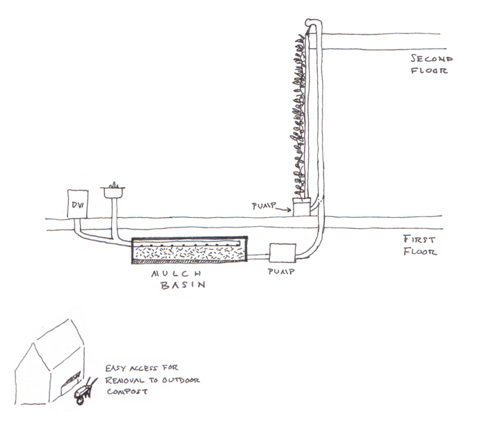 IF the indoor mulch basins could work out, then we may actually be able to keep all of our wastewater treatment indoors, giving us a better chance of meeting code! Fingers crossed! It would also allow us to reuse that treated greywater for our indoor greywater garden wall.