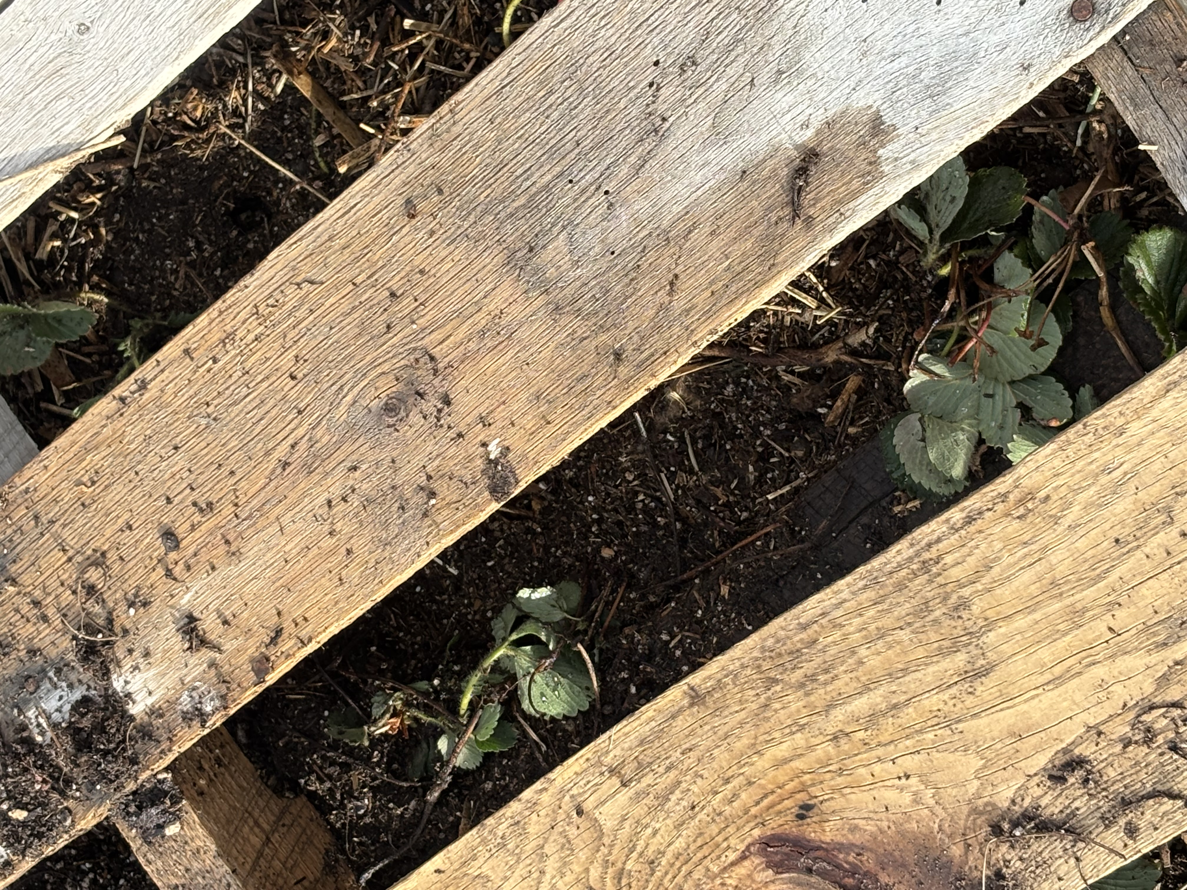 Photo below. I watered, loosened the soil, applied my amendment materials, put the pallet in place, then added the strawberry plants. I will probably toss some seeds in there since I will be watering, probably white clover.