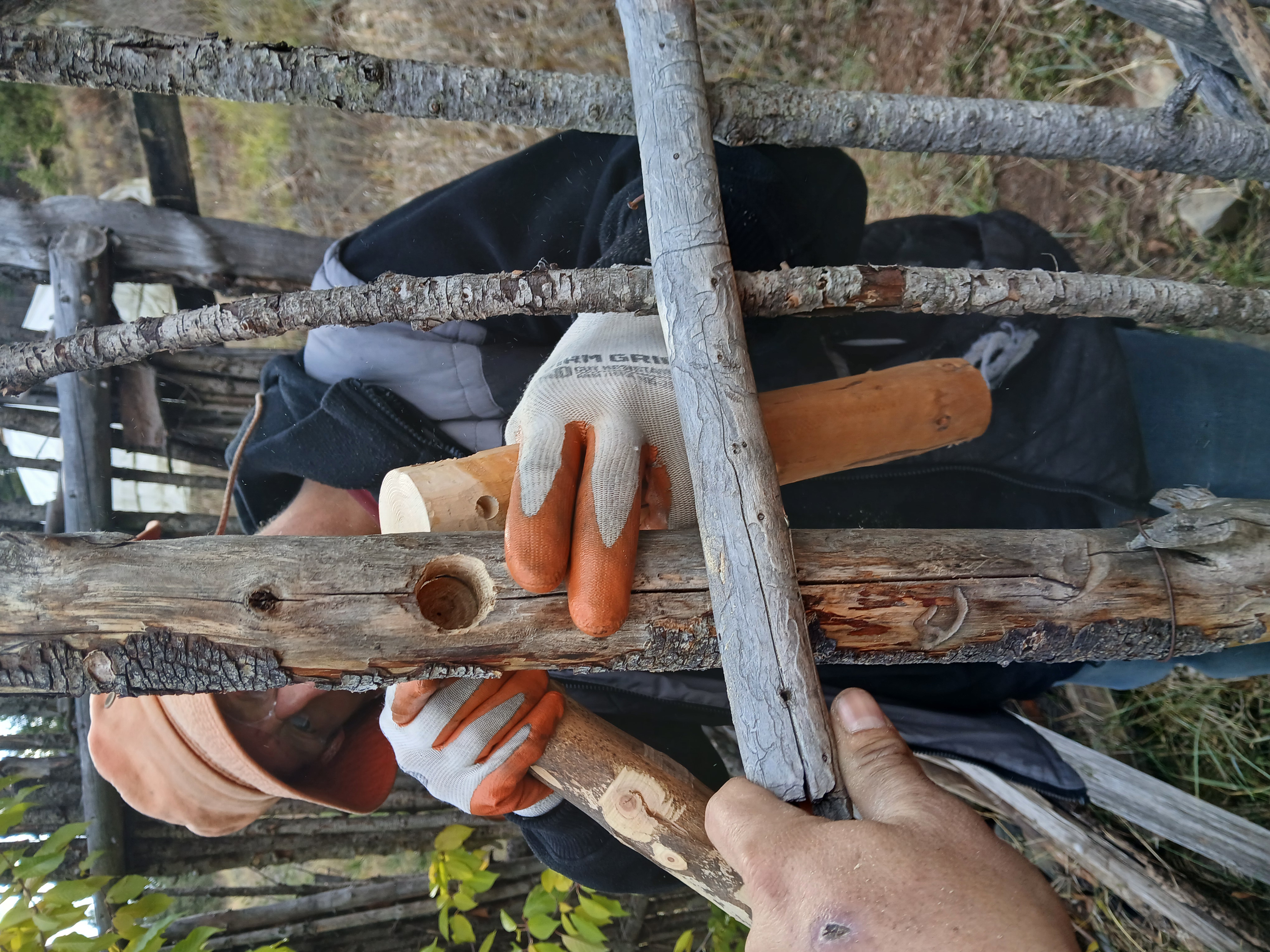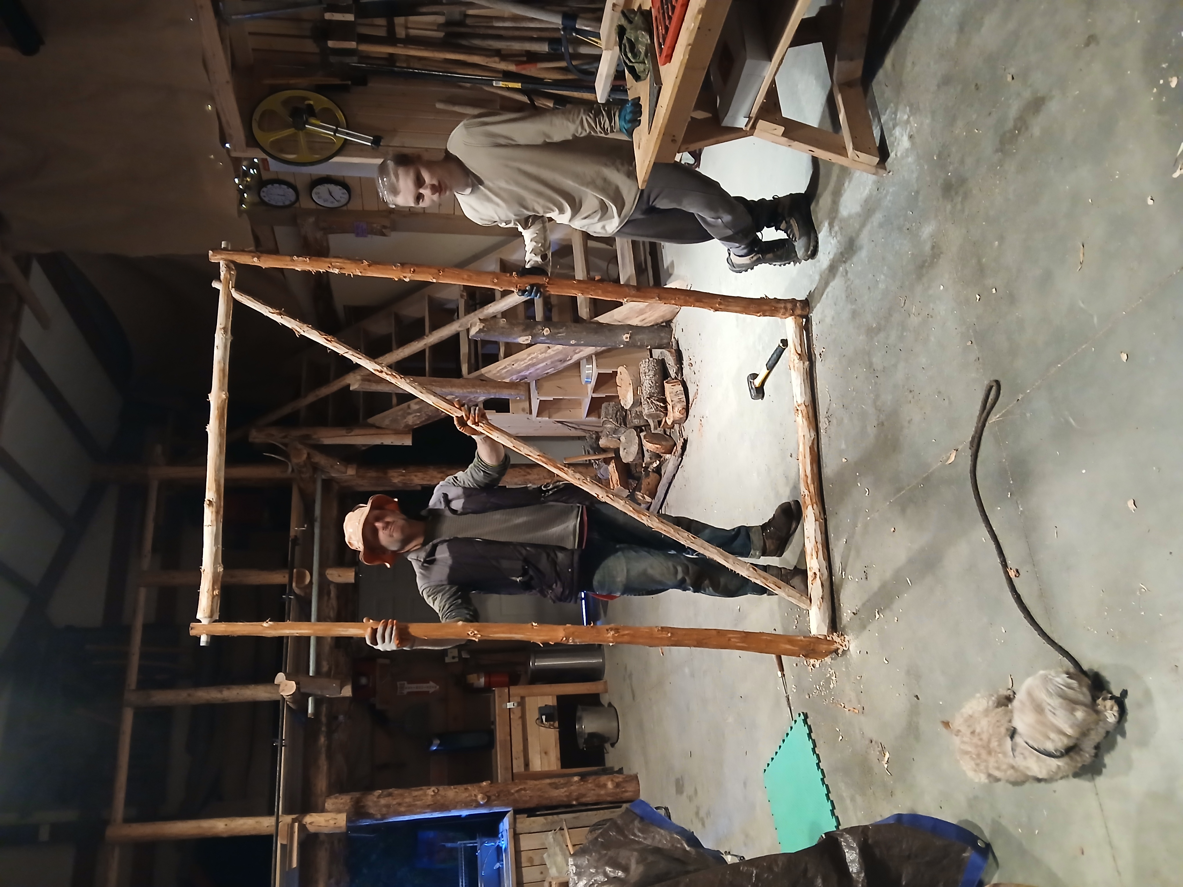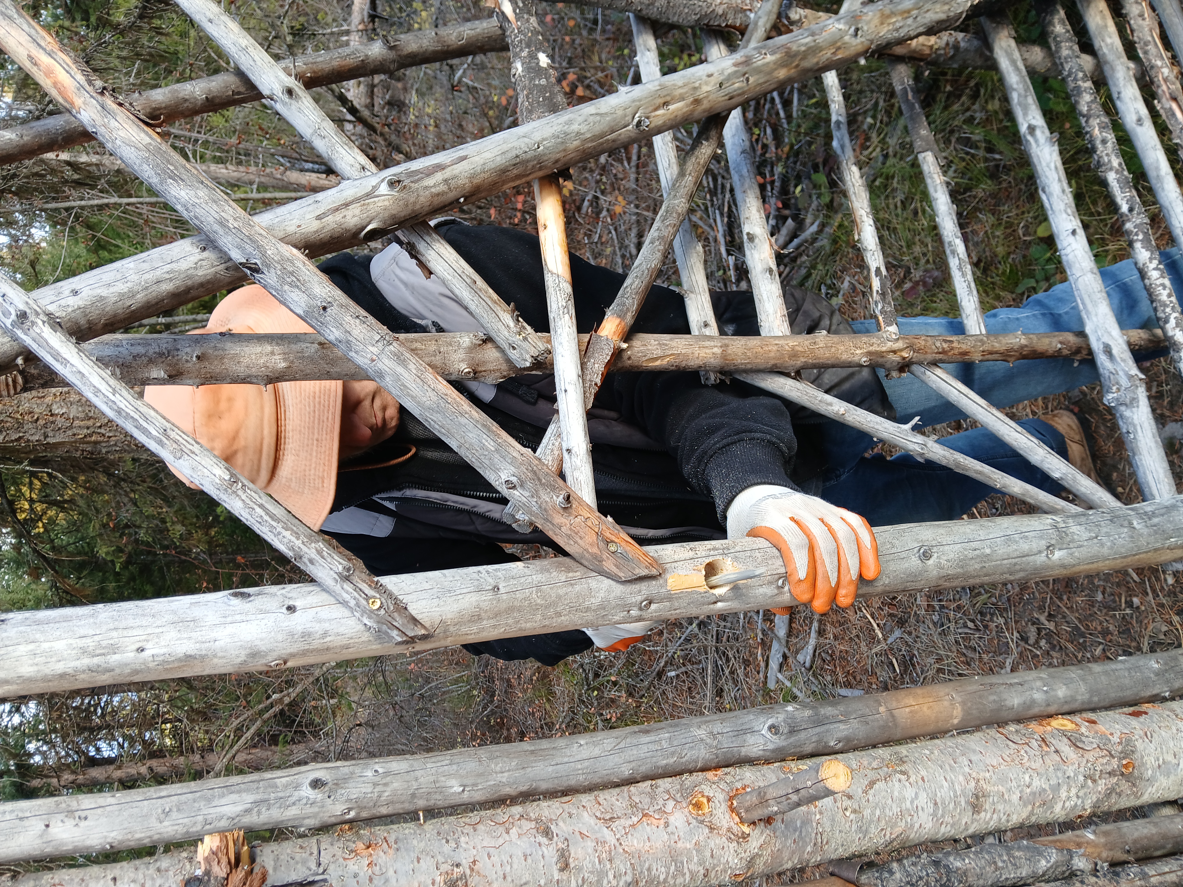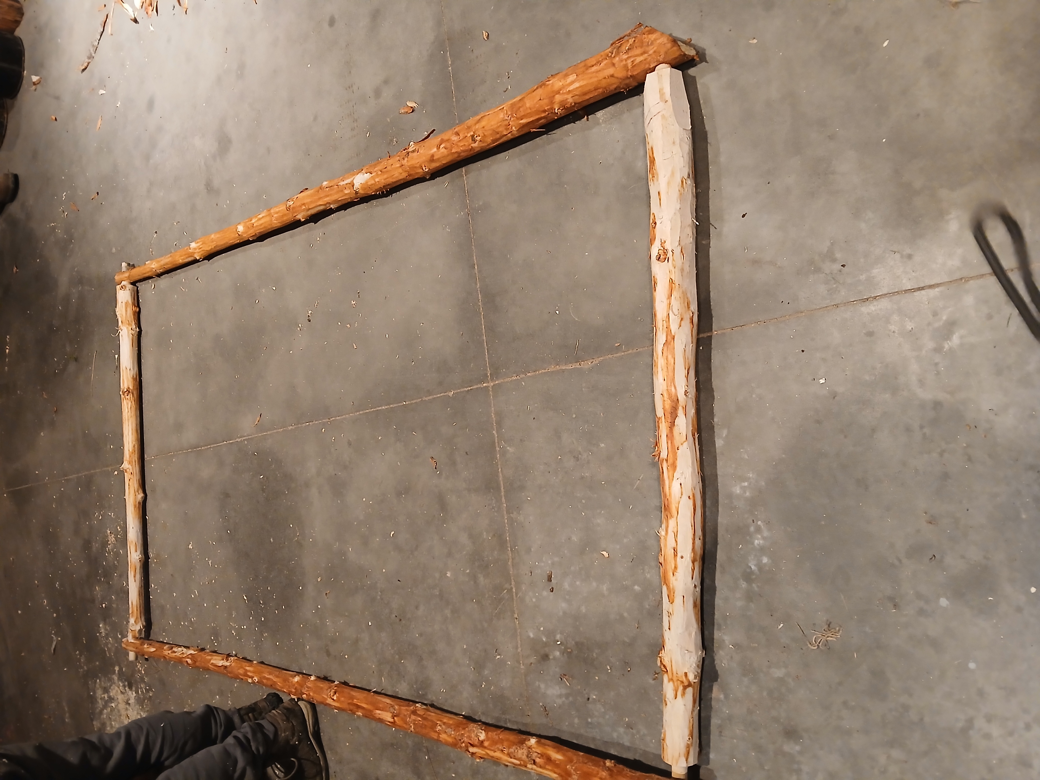 When we got back to basecamp, we shifted gears to the next big task: felling two trees to build a brand-new, stronger, sturdier gate from the ground up. After felling, logging, and debarking the trees, we finally got the frame laid out and ready for the next phase.