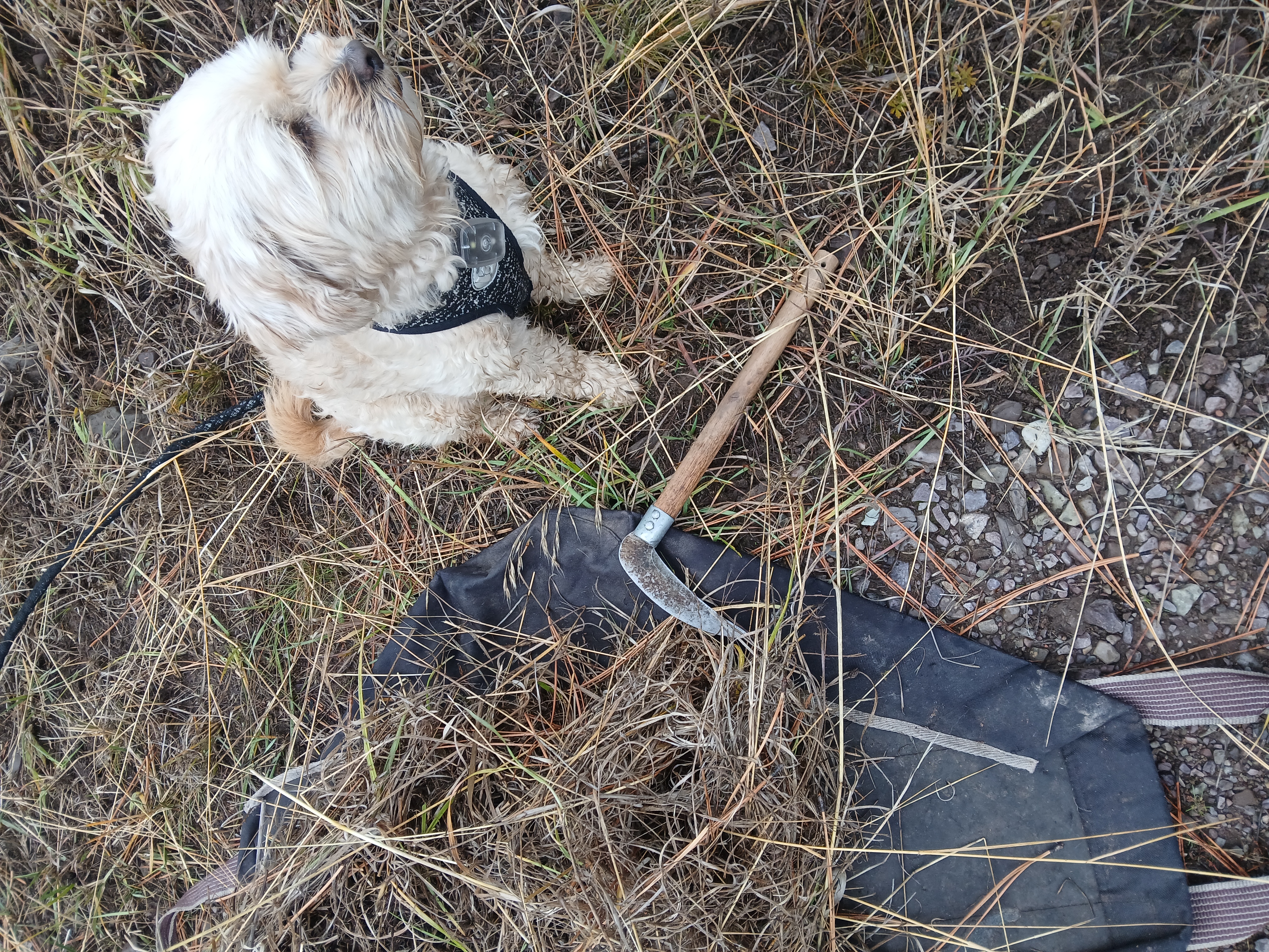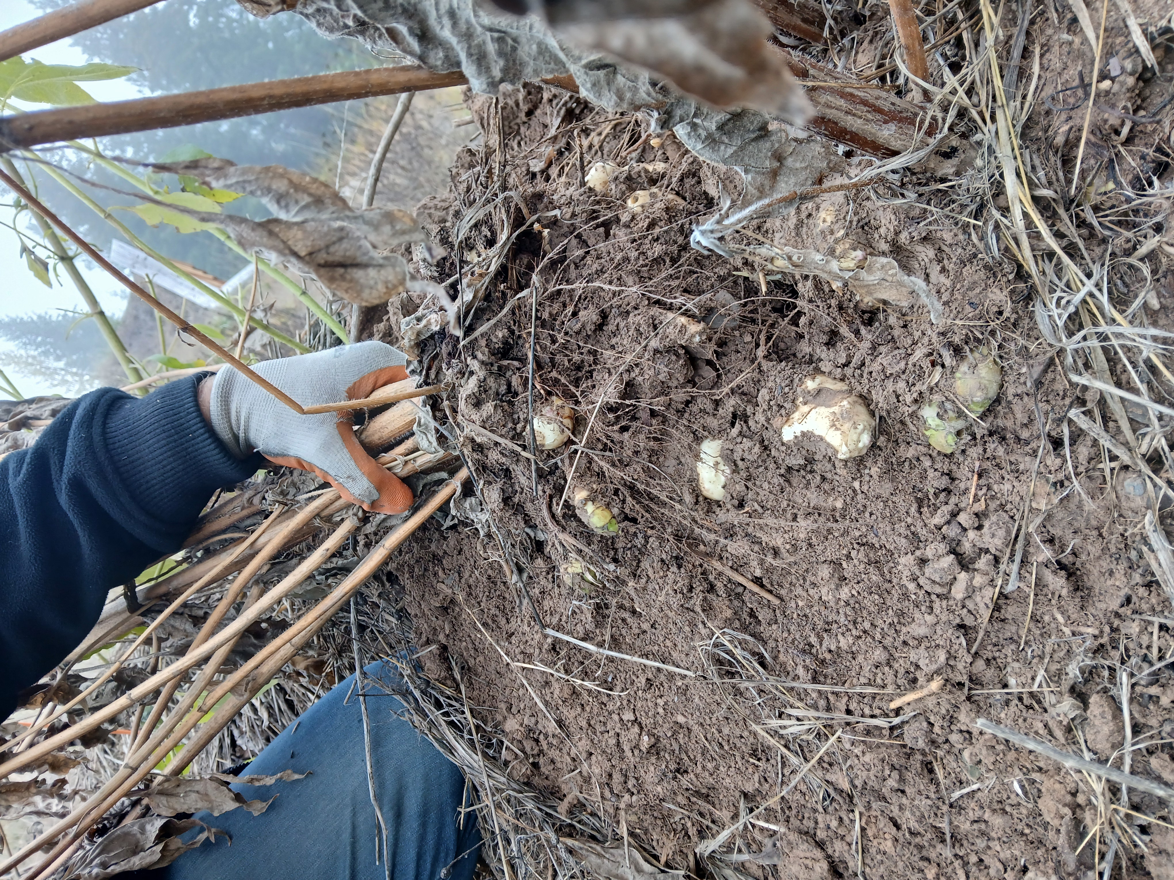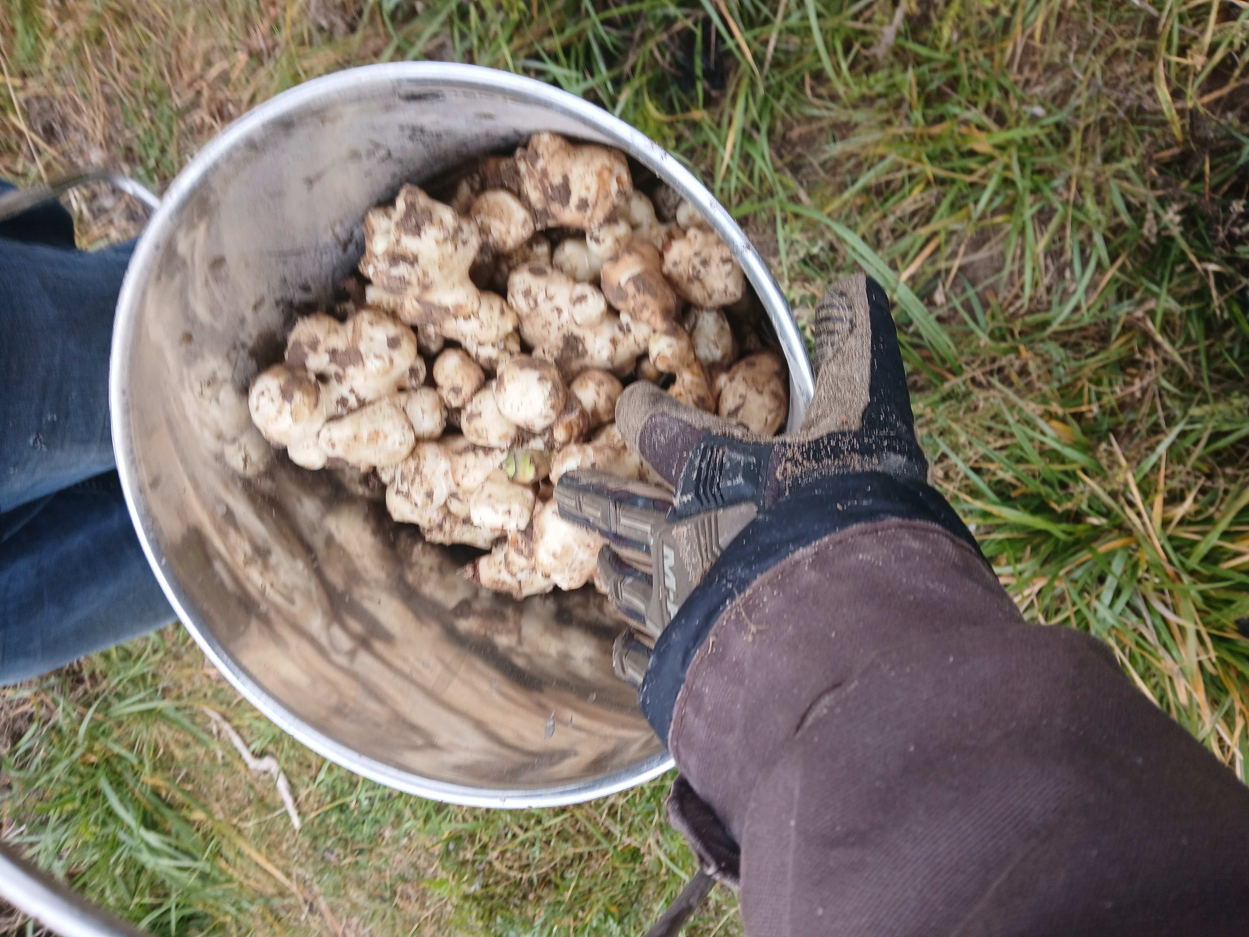 After assessing the situation and resetting the gate, we ventured over to the "Dances with Pigs Meadow" to collect mulch — a task always made better with good company and good dirt. Back at the Abbey, we harvested about half a pail of sunchokes, which we then started planting around the berms at the Tipi site.