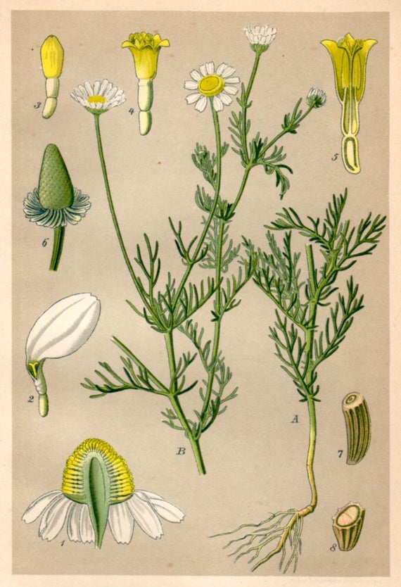 Chamomile produces perspiration, is soothing and antispasmodic. It is antiseptic and anti-inflammatory, especially in cases of inflammation of the mucus membranes. Externally, chamomile is used as a compress and a wash for inflamed eyes, conjunctivitis, moist and itching eruptions, wounds, and as a gargle for toothache. Anyone who starts feeling aggravated should drink a cup of chamomile tea and soon the wonderfully soothing and sedative effect is felt. Very much recommended is a warm chamomile pillow applied to aching parts.