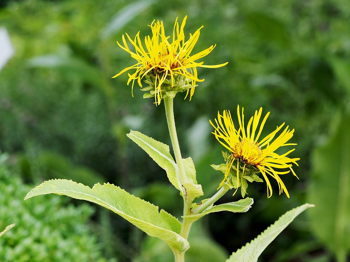 Elecampane has a long history of use as a medicinal herb. A gently warming and tonic herb, it is especially effective in treating coughs, consumption, bronchitis and many other complaints of the chest as well as disorders of the digestive system. A very safe herb to use, it is suitable for the old and the young and especially useful when the patient is debilitated. It cleanses toxins from the body, stimulating the immune and digestive systems and treating bacterial and fungal infections. The root is alterative, anthelmintic, antiseptic, astringent, bitter, cholagogue, demulcent, diaphoretic, diuretic, mildly expectorant, gently stimulant, stomachic, tonic. It is best harvested in the autumn from plants that are two years old, and it can be dried for later use. The roots should be at least 3 years old according to another report. This remedy should not be prescribed for pregnant women. An extract of the plant is a powerful antiseptic and bactericide, particularly effective against the organism that causes TB. The root contains alantolactone, which is strongly anthelmintic. In a 1:1000 dilution it kills the parasitic worm Ascaris in 16 hours. Alantolactone has an anti-inflammatory action, it also reduces mucous secretions and stimulates the immune system. The plant is sometimes recommended as an external wash for skin inflammations and varicose ulcers, but has been known to cause allergic reactions.