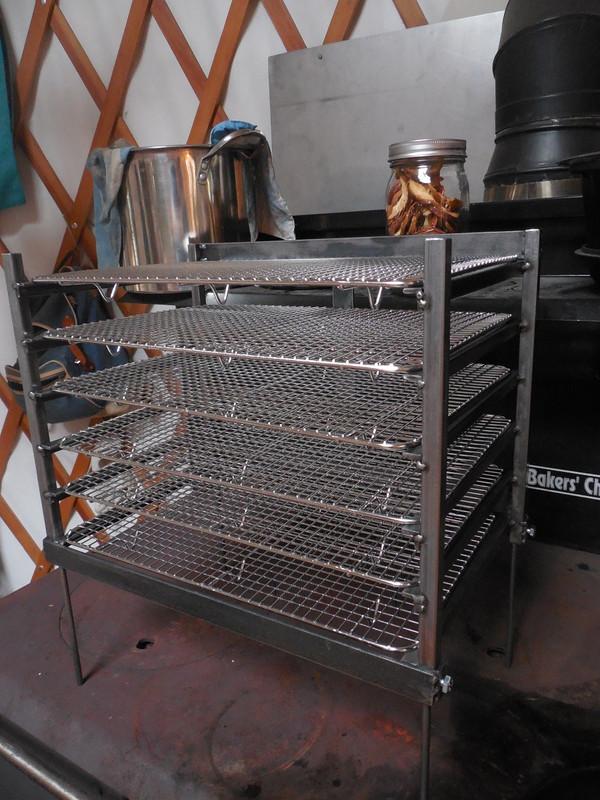 I am now up to 900sq inches of space, and can rotate them quickly and easily. The feet can be adjusted by loosening the bolts at the bottom. If enough persimmons are ripe I will try and weigh how much will fit on a rack, and get an estimate of total capacity.