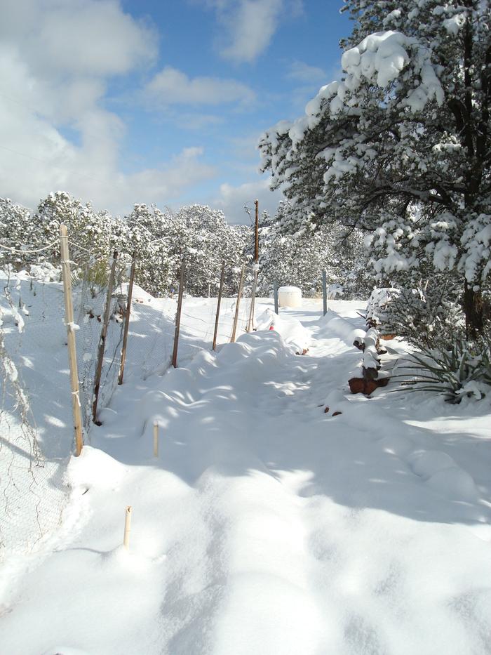 What usually happens is they don't germinate until around late September or early October and then I plant them out with plenty of mulch around December 1st when they're young juveniles, around 8” tall. Then they will grow slowly and happily all winter long. They love the cold and they love snow! I am including pictures that I took back in 2015. The first one shows the 12” of snow we got on January 1st. The 2nd picture is the same path 6 weeks later on February 19th. You can see all the brassicas on the left now that the snow is gone. They loved it! The problem is that come spring there is a 50% chance that they will just bolt. Some years the cabbages bolt while other years it's the broccoli. Don't know why but it sucks. A few years back I tried growing them under 12 gauge wire fencing tunnels (picture # 3) with plastic. But we got a heavy snow again which collapsed all the tunnels and after that ½ of them bolted again. They are after all, biennials and they are supposed to bolt and produce seed after going through winter.