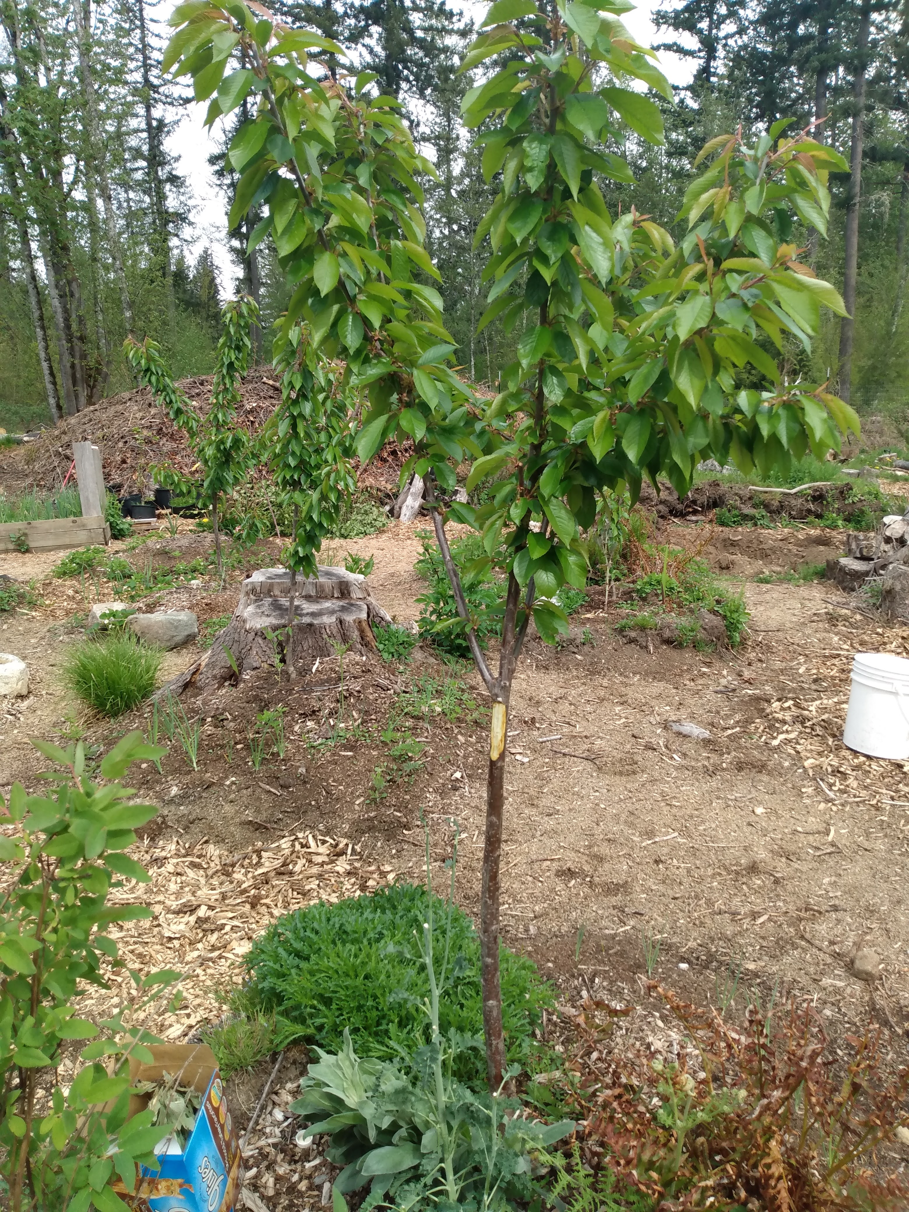 Shortly after planting a dozen cherry trees and beginning our orchard/food forest, deer came in and made a feast of them.