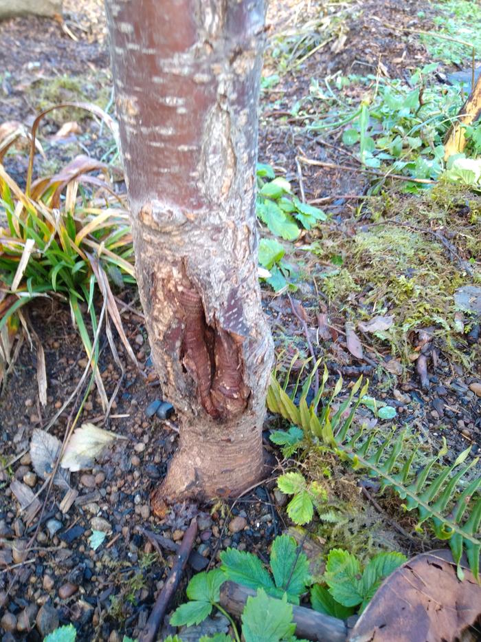 The trunk had to be stripped 1/2 way around I diameter in 3 places. A 4 inch stretch a 2 inch stretch and an inch chunk. The tree was only a year in the ground and 3 years old at most.