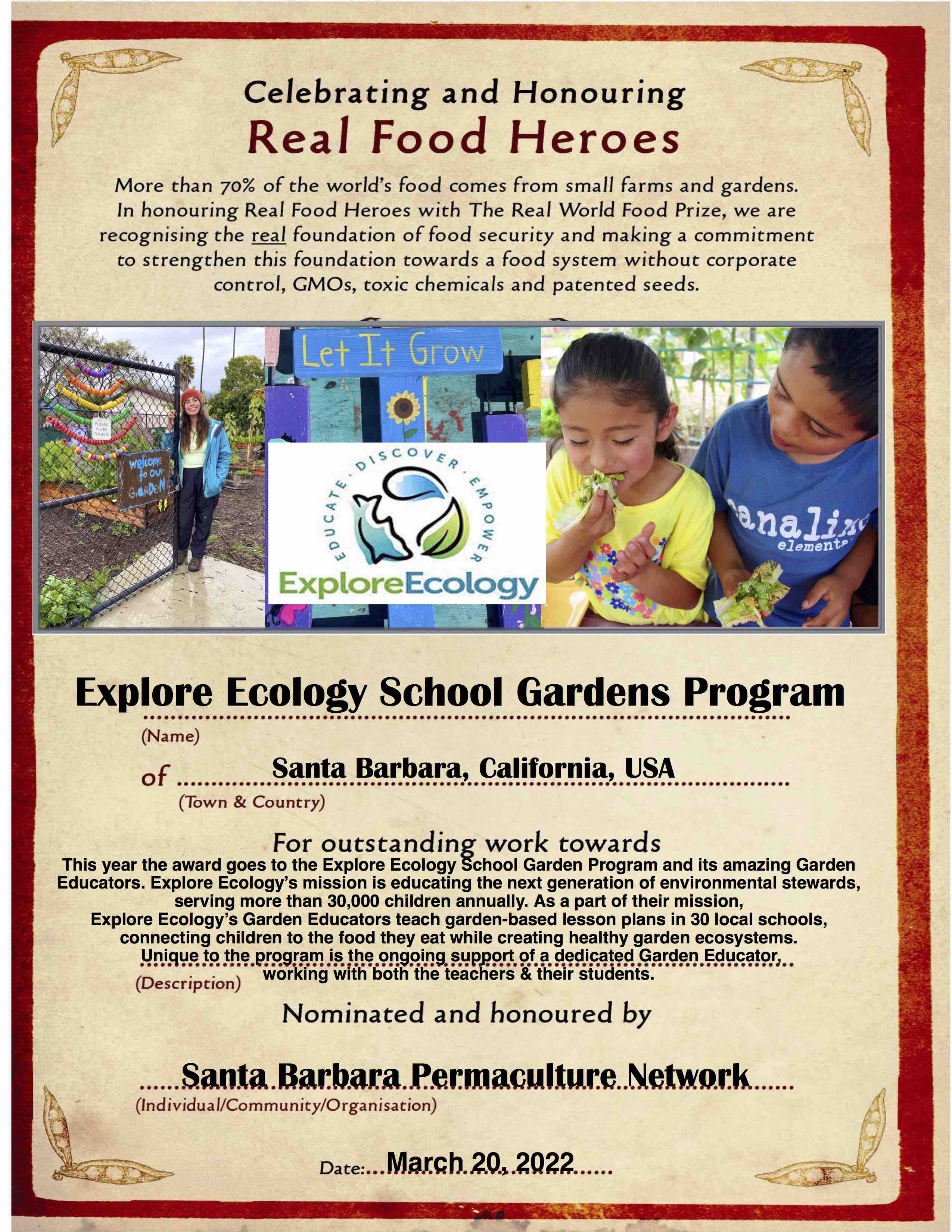 This year’s Local Food Hero Award honors the Explore Ecology Garden Program and its Garden Educators, please join us for an award ceremony at 2pm.