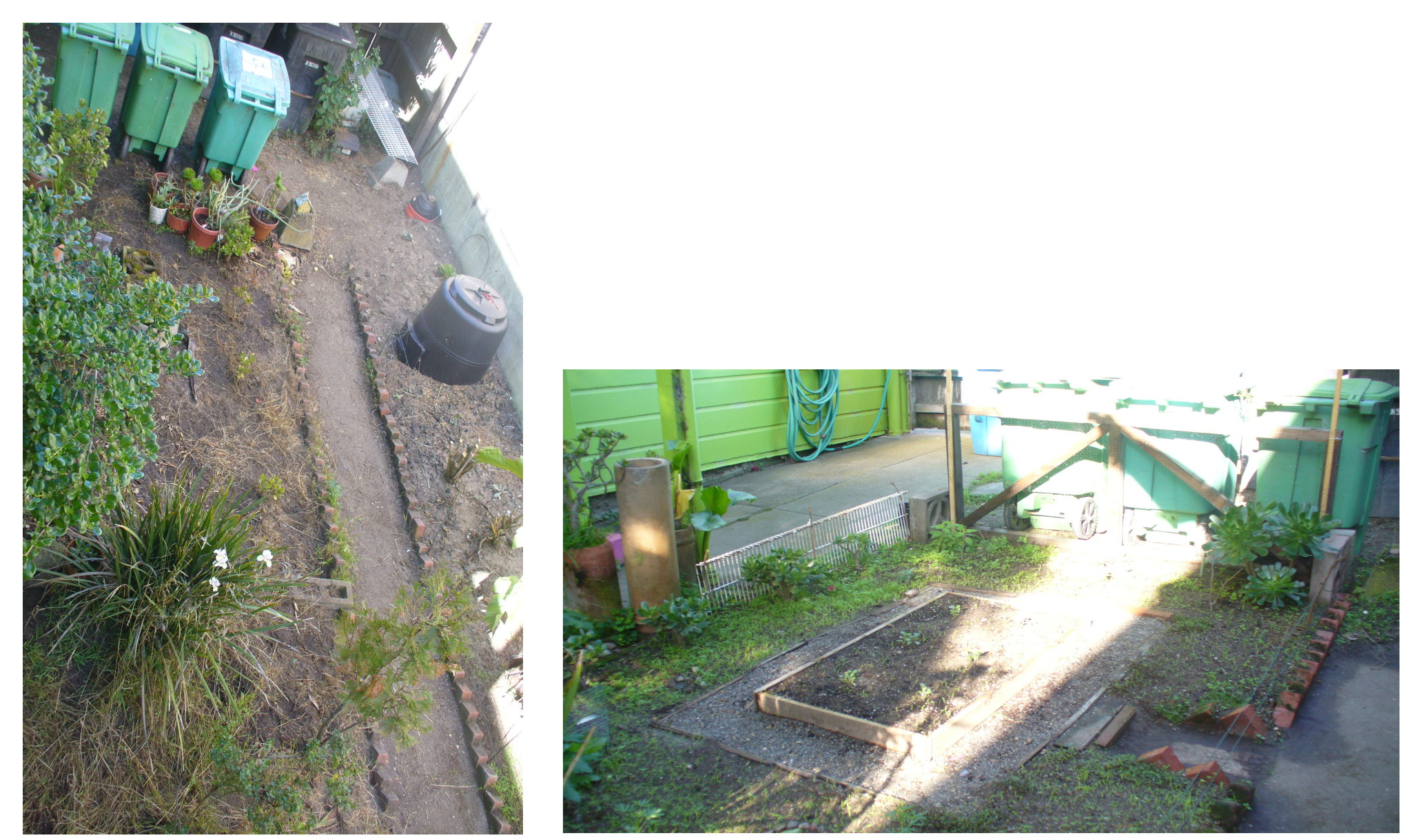Here's some pictures of the yard from 2 years ago, when I first started cleaning it up, and then a year ago.  Orientation is north-south the long ways.  Only the north end is open.  The tree will go where the black compost bin is in the last pic.