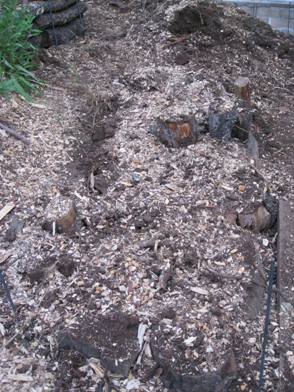 hugelkultur with vertical stumps and wood chips