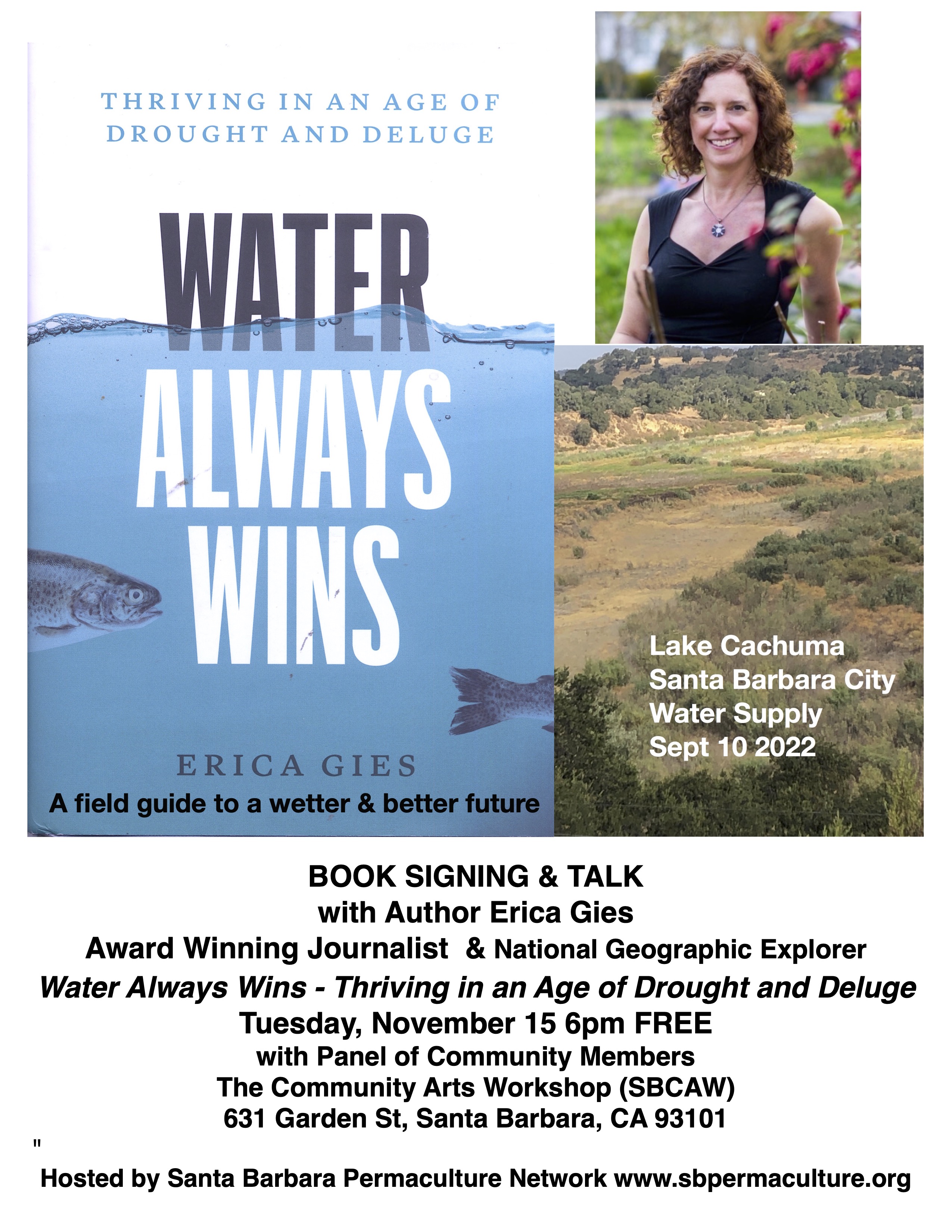Please join Santa Barbara Permaculture Network on Tuesday, November 15 for a talk and booksigning with award winning journalist and National Geographic Explorer Erica Gies with her timely book Water Always Wins, Thriving in an Age of Drought & Deluge.