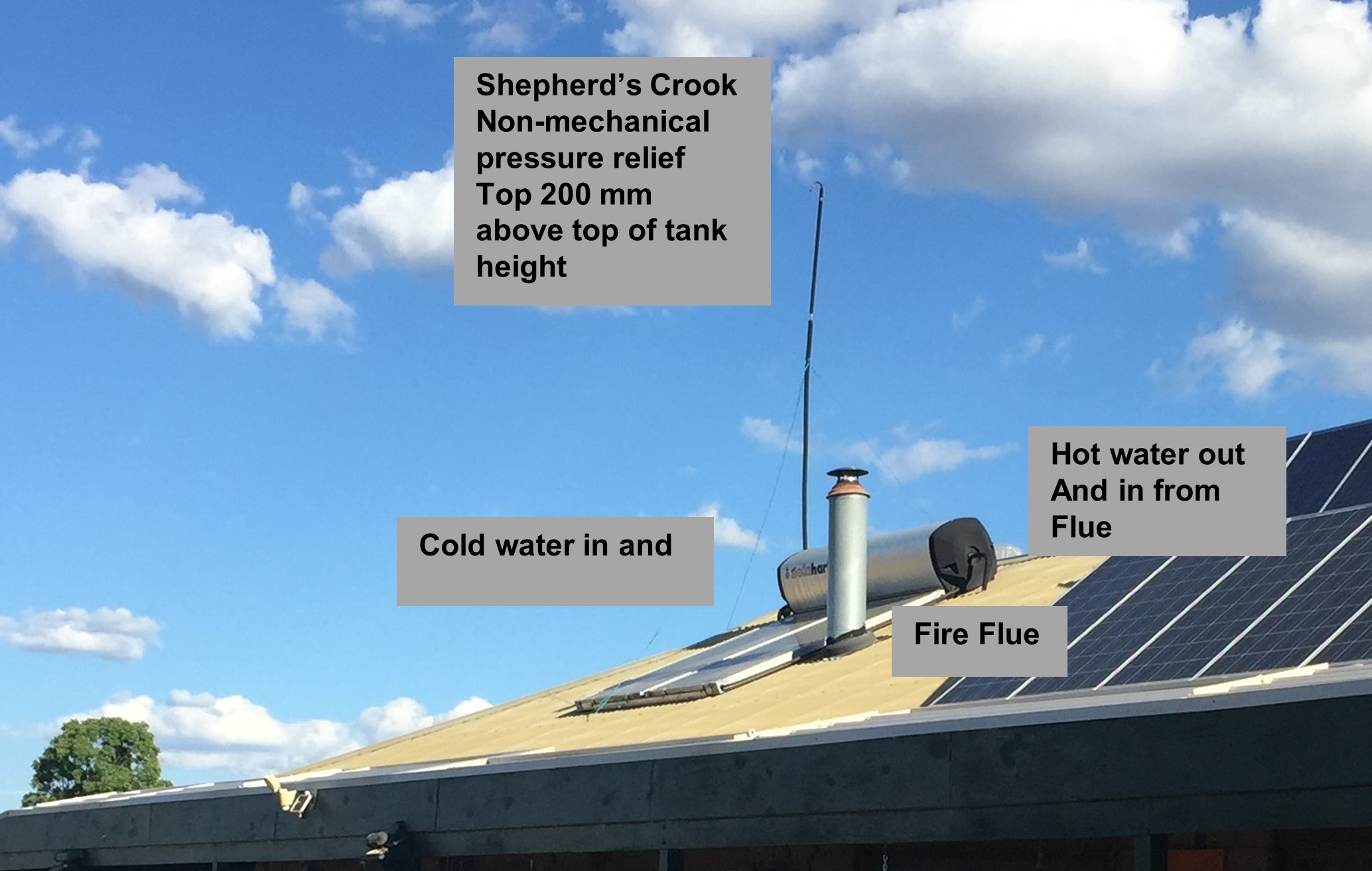 I had a very smart plumber who said anything mechanical can break. The Shepherds crook eliminates the need for a mechanical relief valve. Our solar panels are 50% recommended and the water can boil during summer.