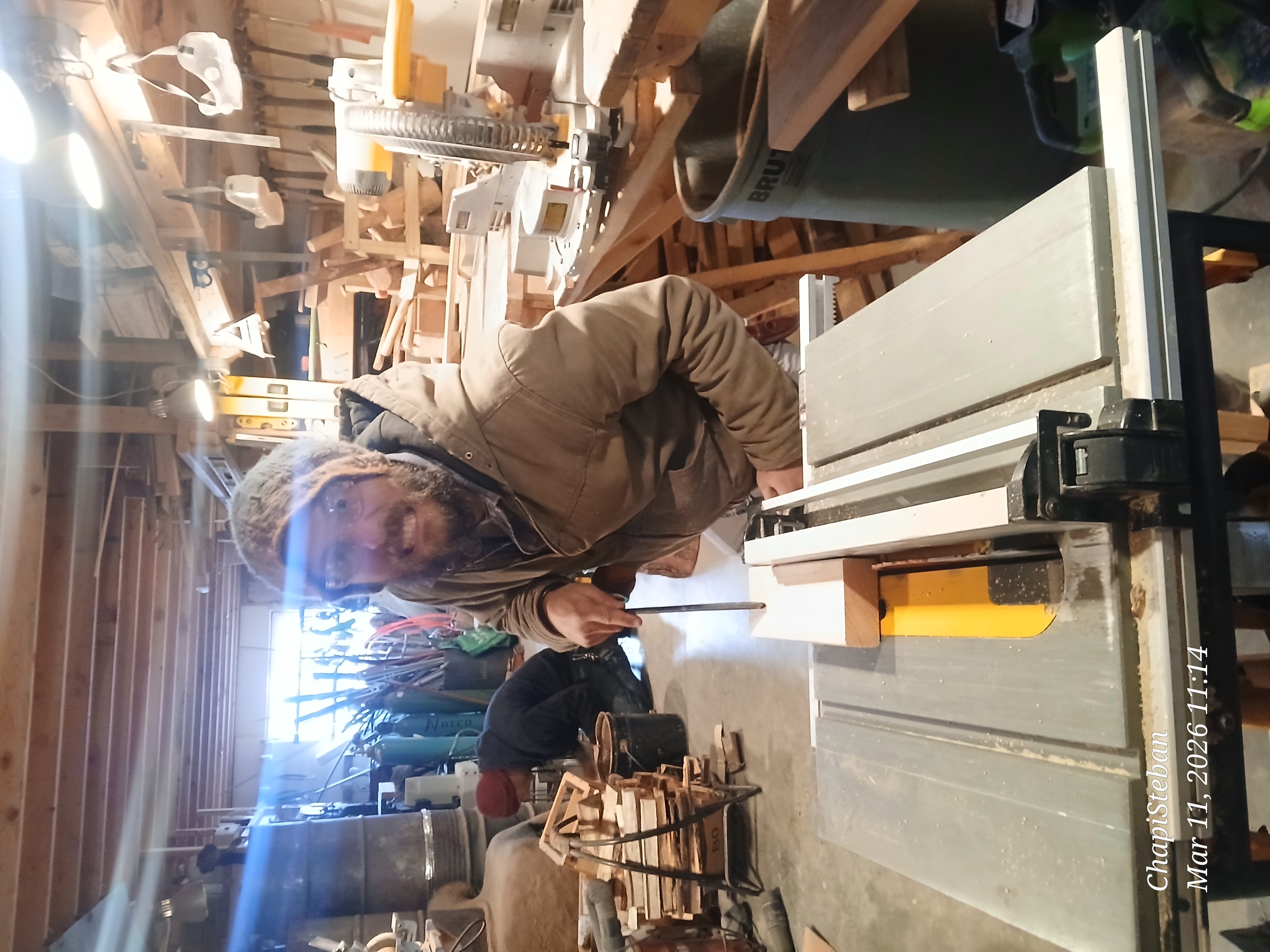 Today started with the morning meeting, and afterwards Harry and I began gathering the necessary tools and materials to continue working on the wood flooring piece at the Abbey. While we were getting everything together, Stephen was busy lighting up the rocket mass heaters at the shop and the Love Shack to get things warmed up for the day.