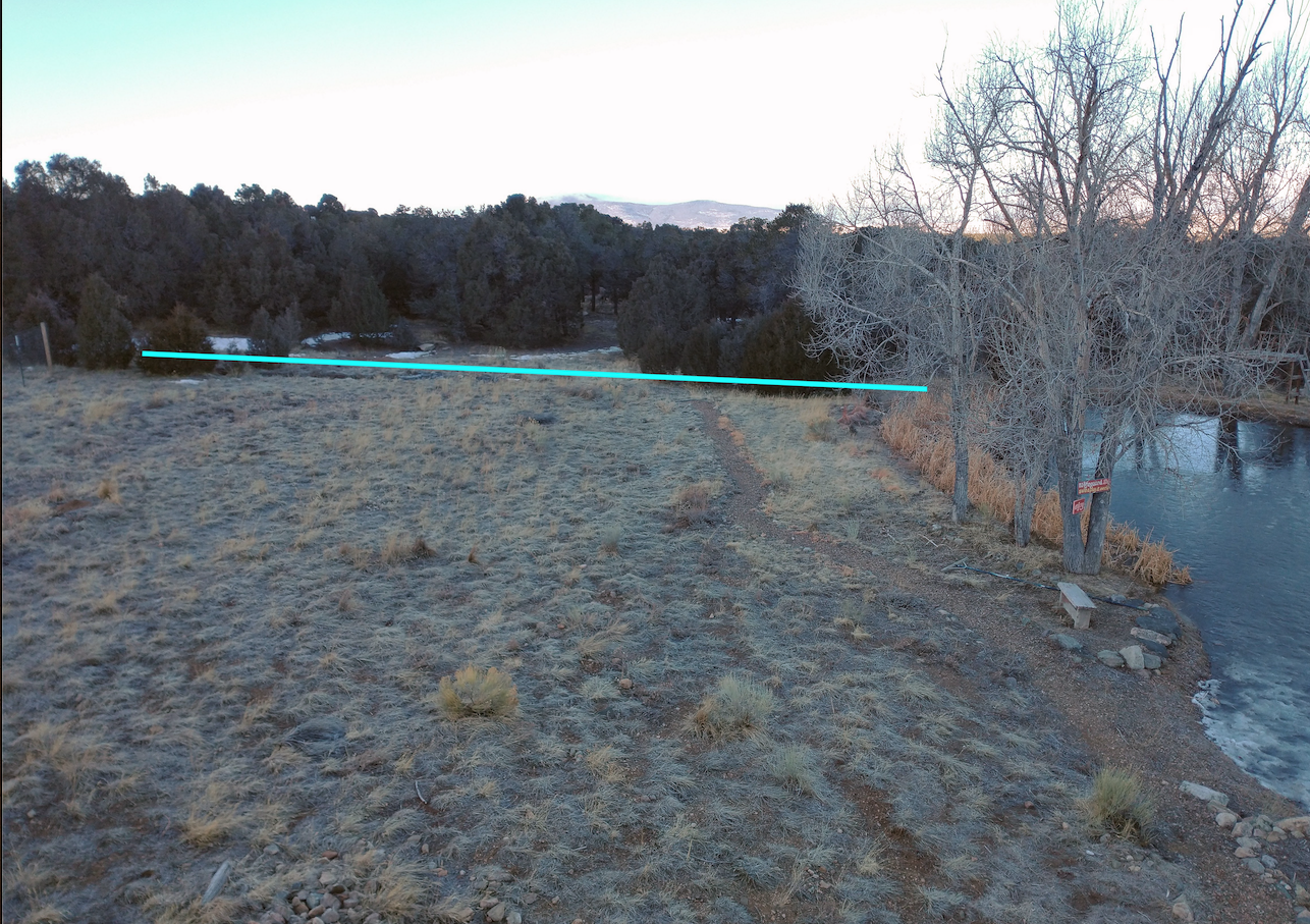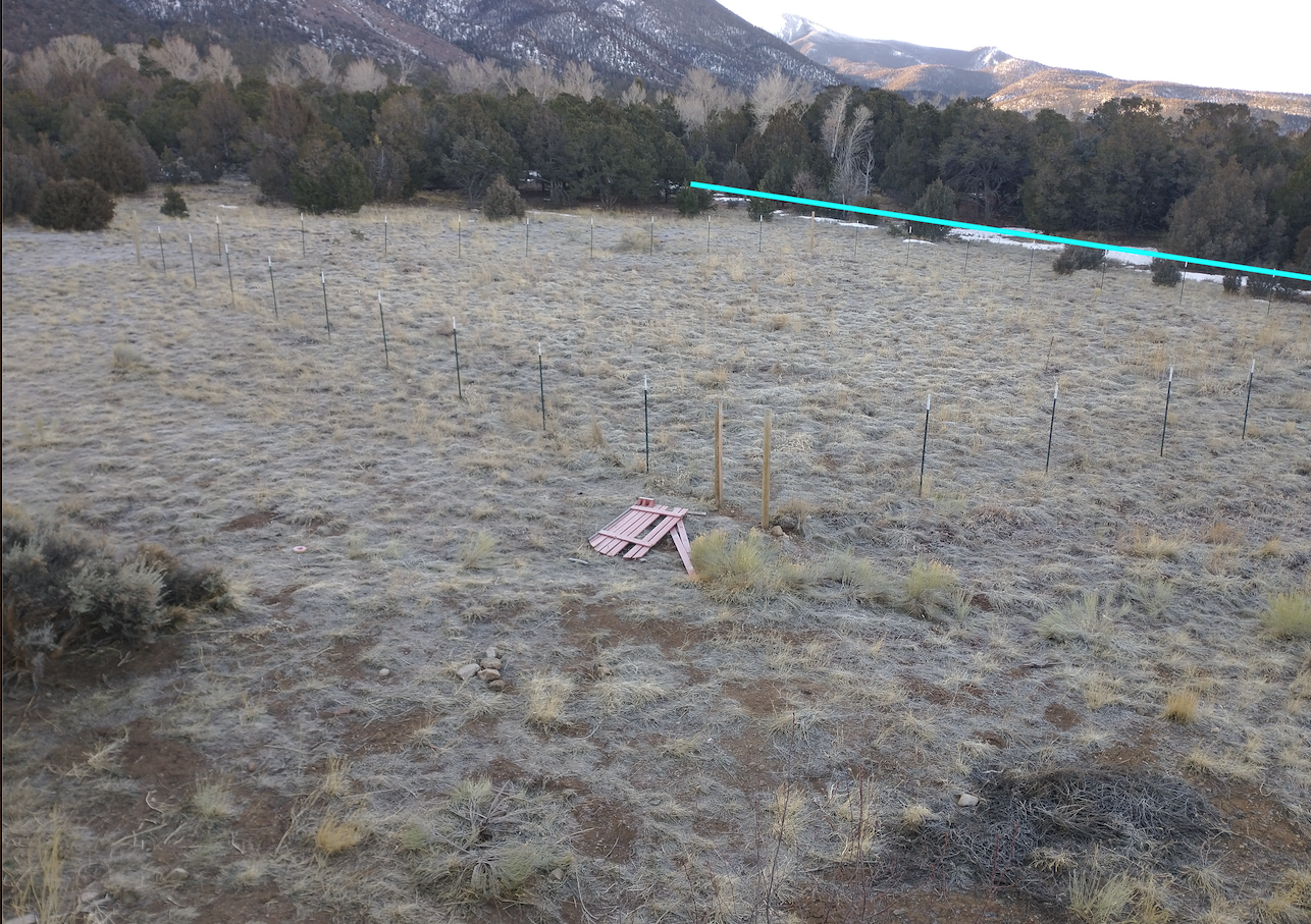 Hello, I am looking for help and advice with regard to irrigating a ~10,000 sq ft. fenced in area at high elevation in the southwest mountains. I would like to focus on annual vegetable production in this area. Mostly corn, squash, potatoes as the staples. The field was formerly pinyon-juniper woodland that was cleared probably 30 years ago. The soil is mostly clay. One great thing that we have access to is water from a perennial mountain runoff stream on the weekends. It comes in at the high elevation point of the property, which is generally sloping at about a 10% grade, one foot of rise for 10 feet of run. The water runs down into a substantial pond that is located below the field. I am attempting to attach images, I have marked out the location of the ditch with the teal line.