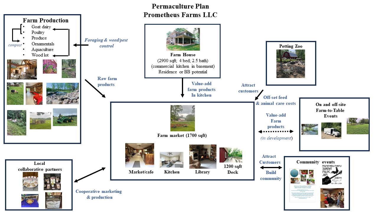 Prometheus Farms LLC is a permaculture-based 11-acre farm that includes 2865 sqft renovated heritage farm house; integrated production facilities; two commercial kitchens; fully developed farm market & café; and numerous boutique event staging areas, among other features. The well-appointed farm house includes 4 bdrms/2.5 baths; spacious first floor kitchen; generous living space and gorgeous front and rear porch/decks. The farm production includes vegetables & fruit; dairy goat; free range eggs; aquaculture (2 ponds); and an abundant woodlot. Our two-story 3400 sqft Amish-built barn with all services houses a 1200 sqft farm market & café; 500 sqft commercial kitchen; powder room; 1200 sqft wrap around deck; and 1700 sqft second story ready for development into an apartment or B&B. We are located on a quiet road just ¼ mile from the NYS boat launch on Conesus Lake, which hosts a thriving summer tourist community. The listing price for the property including all structures is $799,000, whereas the business package, including all farm, market, and kitchen equipment & accessories, as well as all marketing networks, is $150,000. For more information on this listing please reference MLS #R1477585; our Facebook page (@prometheusfarmmarket); or call Agnieska Bajan of Empire Reality Group at 585-519-2139. Questions regarding the farm production & business can be addressed to Robert Gallagher by email: