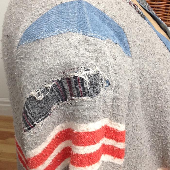 The holes in the blanket were patched with more scraps of the lapel flannel except for the large shoulder piece where I went with denim. To do the patching, I just did many crisscrossing runs of zigzag stitch on the machine with white and a matching grey thread.