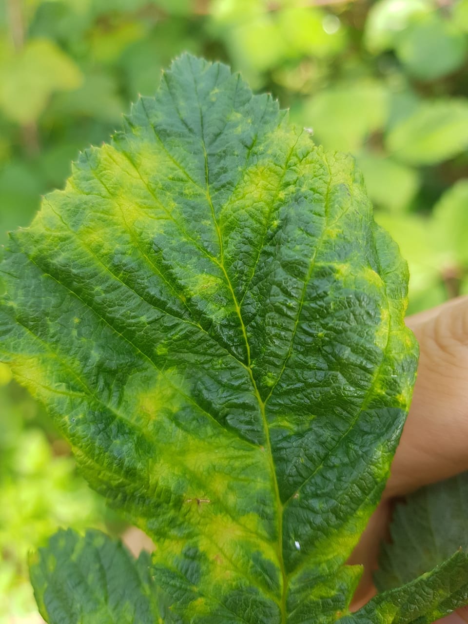 My question is about a raspberry plant that last year showed no symptoms, but this year, despite doing immensely well (canes reaching for the sky 2.5 meters+), they started discolouring maybe somewhere in mid-August, at least that's when I first noticed the discolouration.