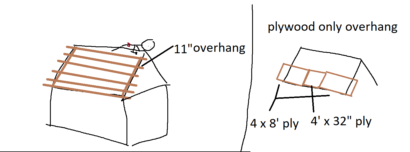 16 x 16 cabin. 45 degree roof pitch. 5/8 plywood roof sheathing, tar paper then horizontal 1" x 4" x 8' boards 16" OC, then metal roofing screwed on top. The 1 x 4" boards will overhang 11", and the metal roofing exactly 1" beyond this (acting as a drop edge) - so total overhang is 1ft.