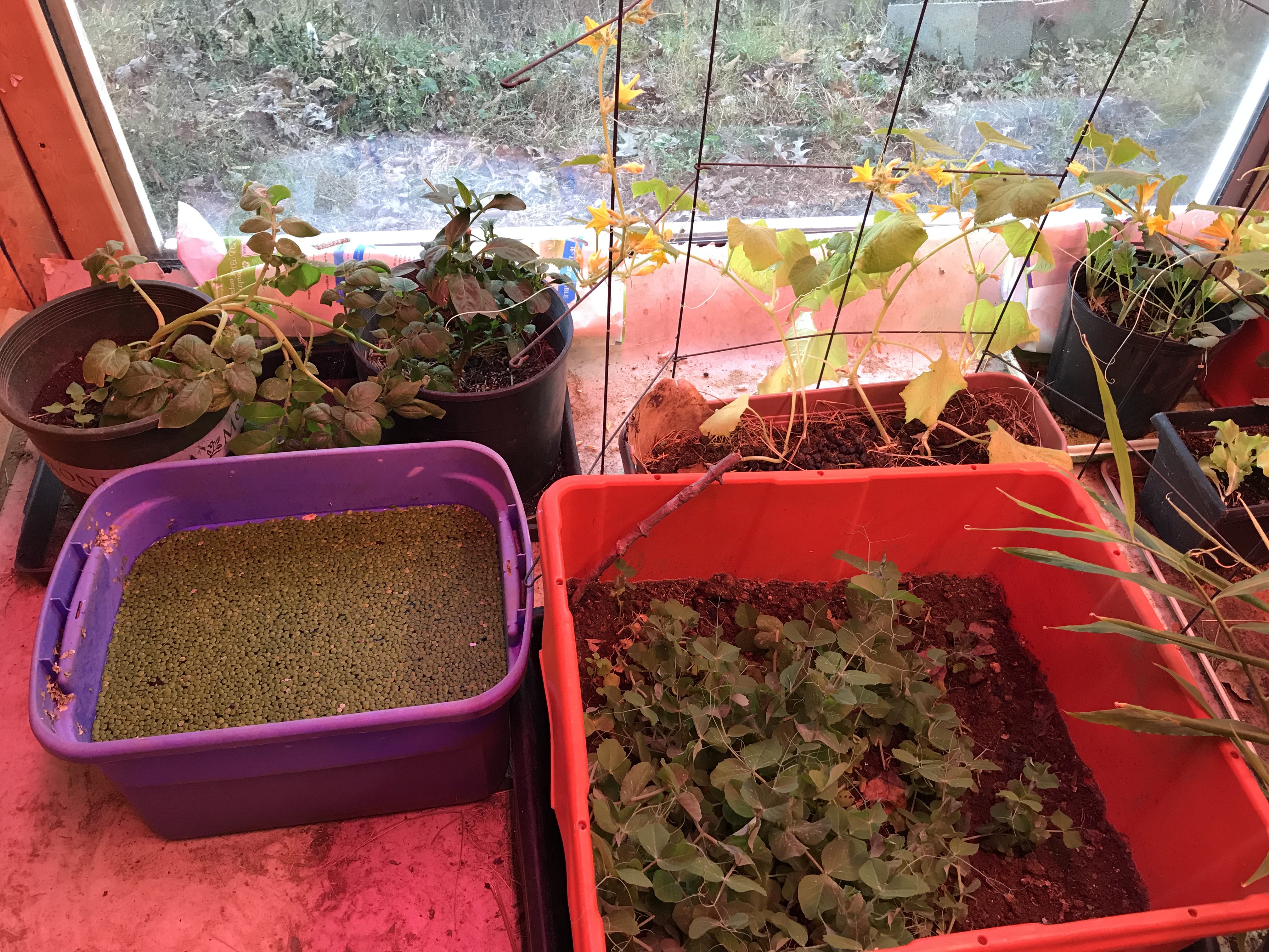 Then I started putting a few potted vegetables in, but you know how that works. It always gets out of hand and I never know when to stop. So now it is full of plants; sugar snap peas, the pots of ginger that can’t grow outside in winter, pots and grow bags of Irish potatoes, cuttings from the sweet potatoes I’d already harvested, and a tray of cucumbers. I dug up, pruned back and potted out a tomato and a pepper plant, both of which are blooming now in 18 degree weather in December. The collards, spinach, broccoli and lettuce can take the cold, but I don’t know if we can keep it warm enough for the summer stuff as it gets colder. Sometimes it gets 7 below zero Fahrenheit here, but not every winter and if so not more than a day or two. He did a dropped ceiling and since he mills lumber from trees on our property, had plenty of nice boards to better insulate the walls, but due to the way it is built there are still some air leaks we can’t do anything to stop. One problem is the big sliding door which has two inches space between it and the inside wall. I hung a big quilt over that on a rod which swings in to open it, or I can just lift a corner when I come in. We did have to put in a few grow lights as the winter days are too short for the heat and light loving plants. I need a RMH!