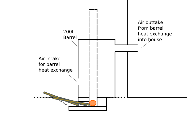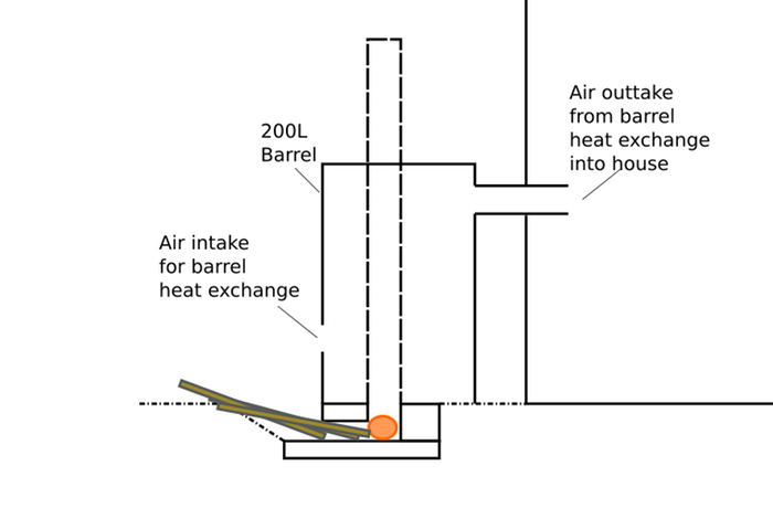 He surrounded the barrel stoves with tons of thermal mass in the form of dry stacked stones.