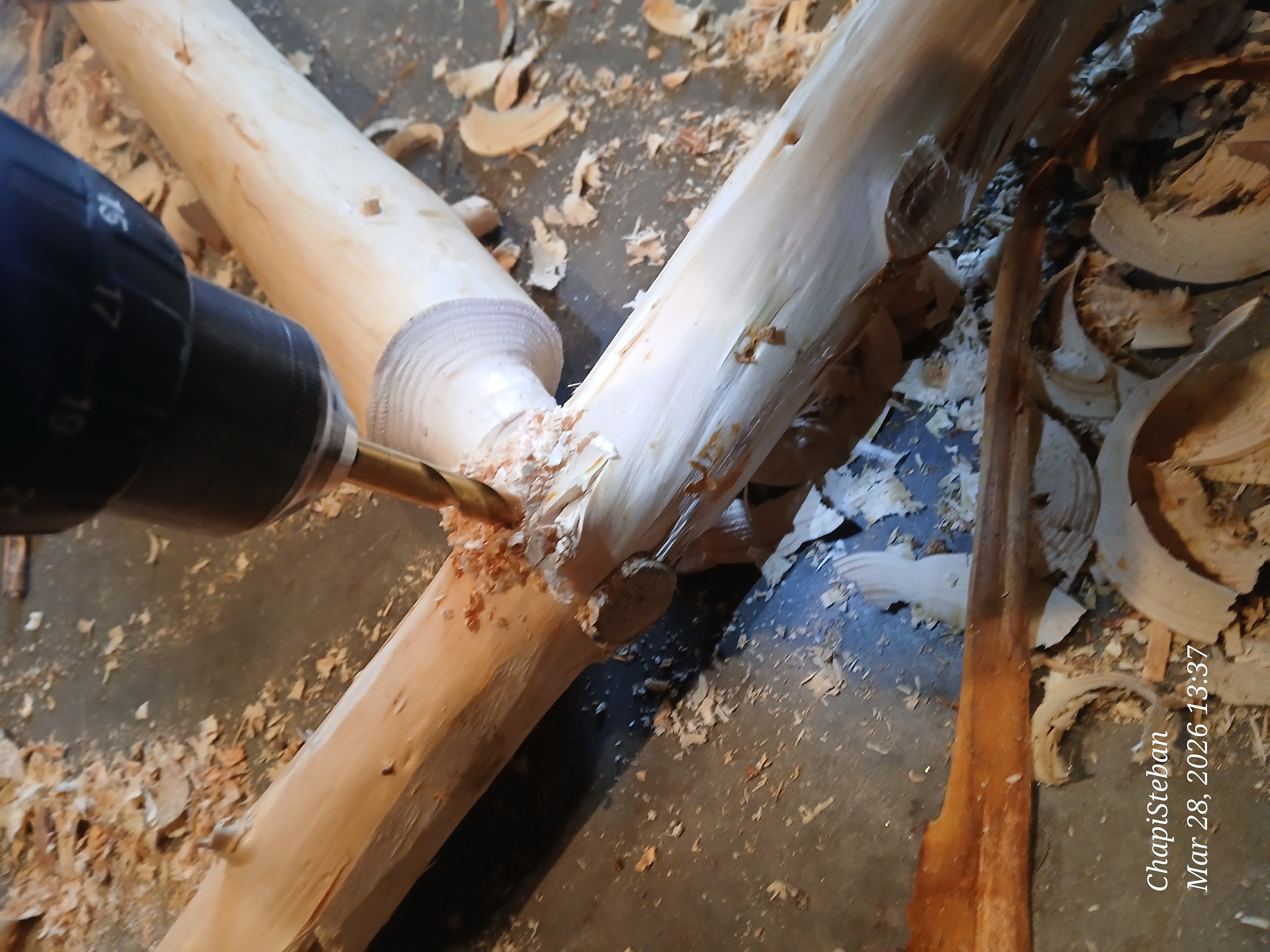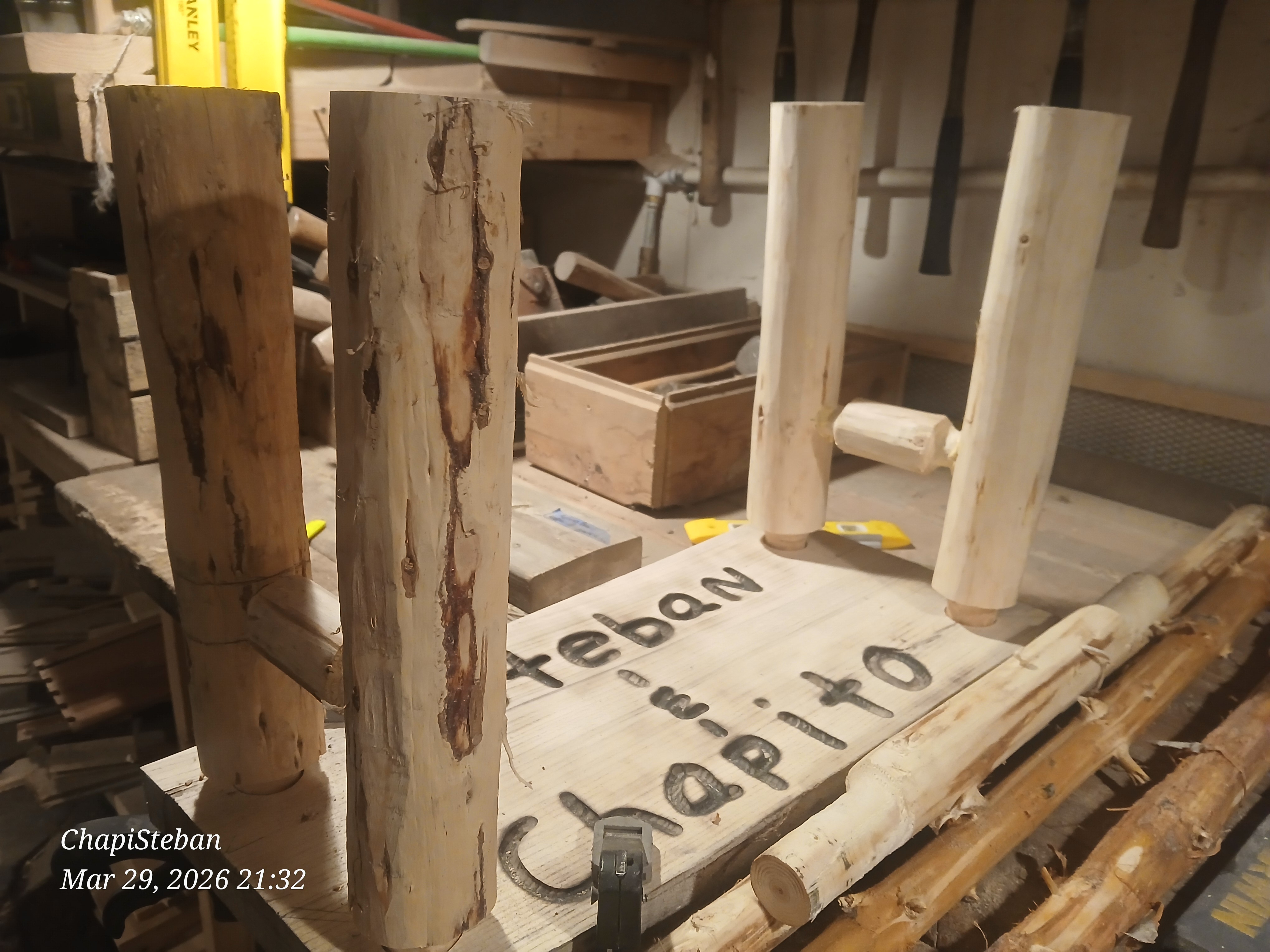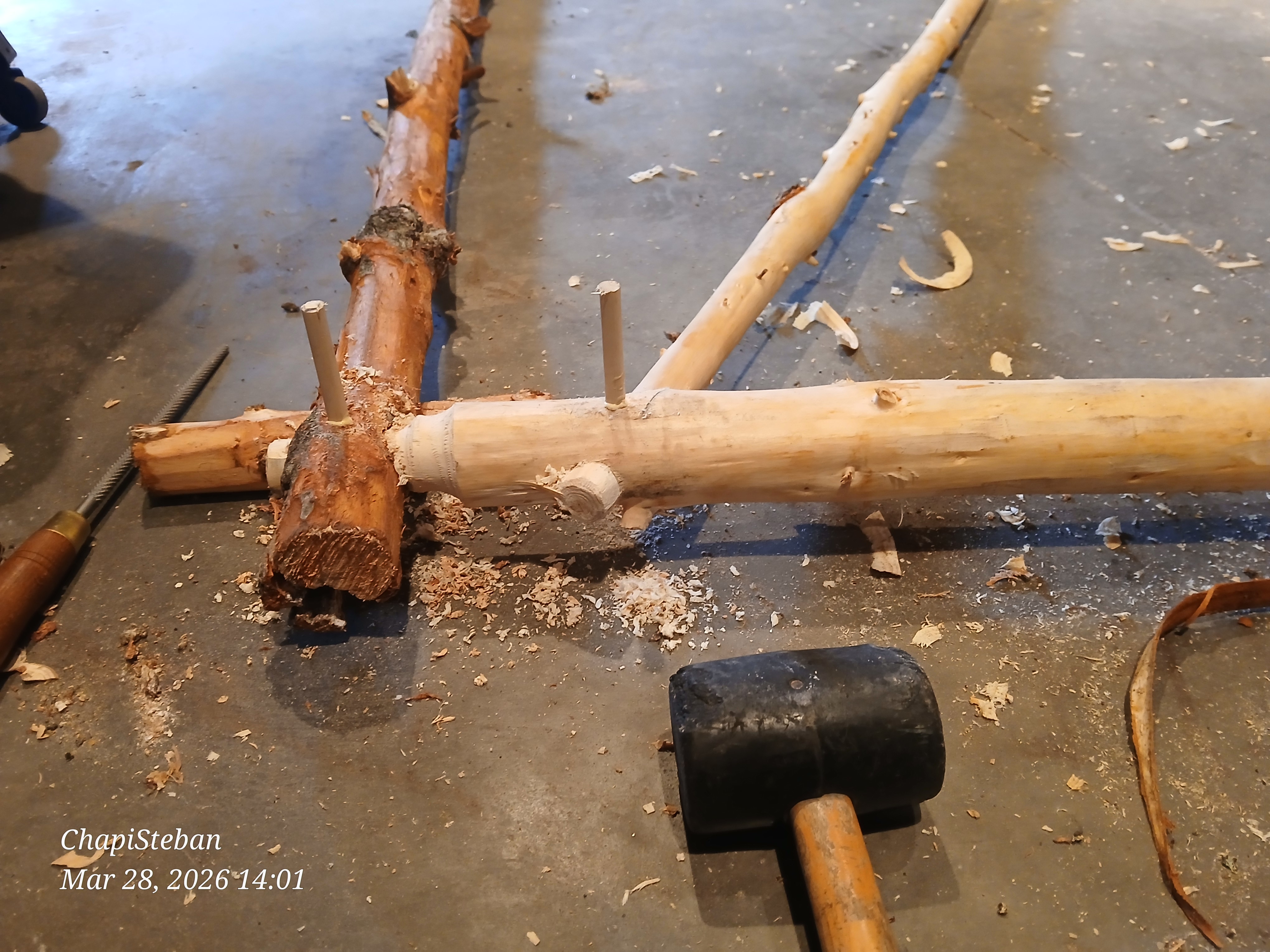 So far, I’ve completed a roundwood stool and an end table, and more recently, worked alongside fellow Boots to build a garden gate from trees we harvested ourselves—using mortise and tenon joinery, drawboring, no metal fasteners, and no glue.