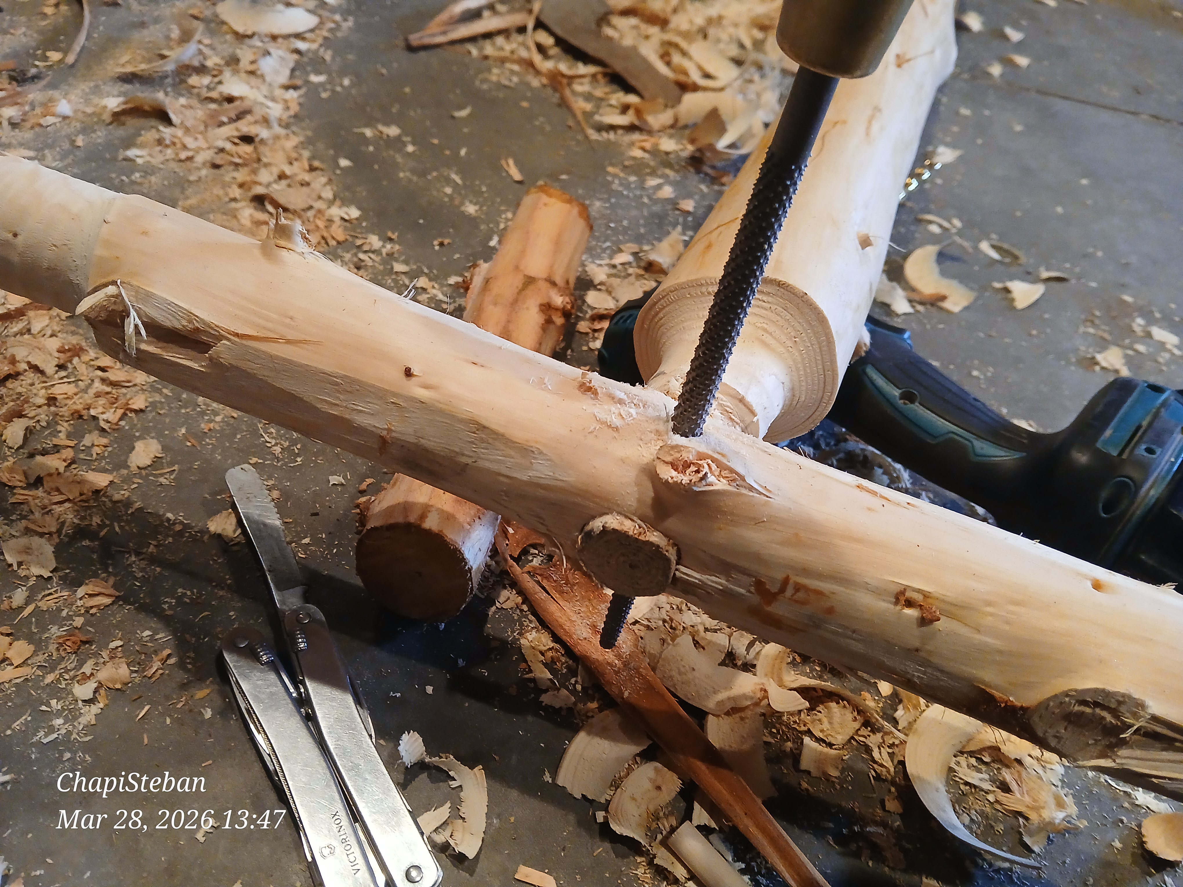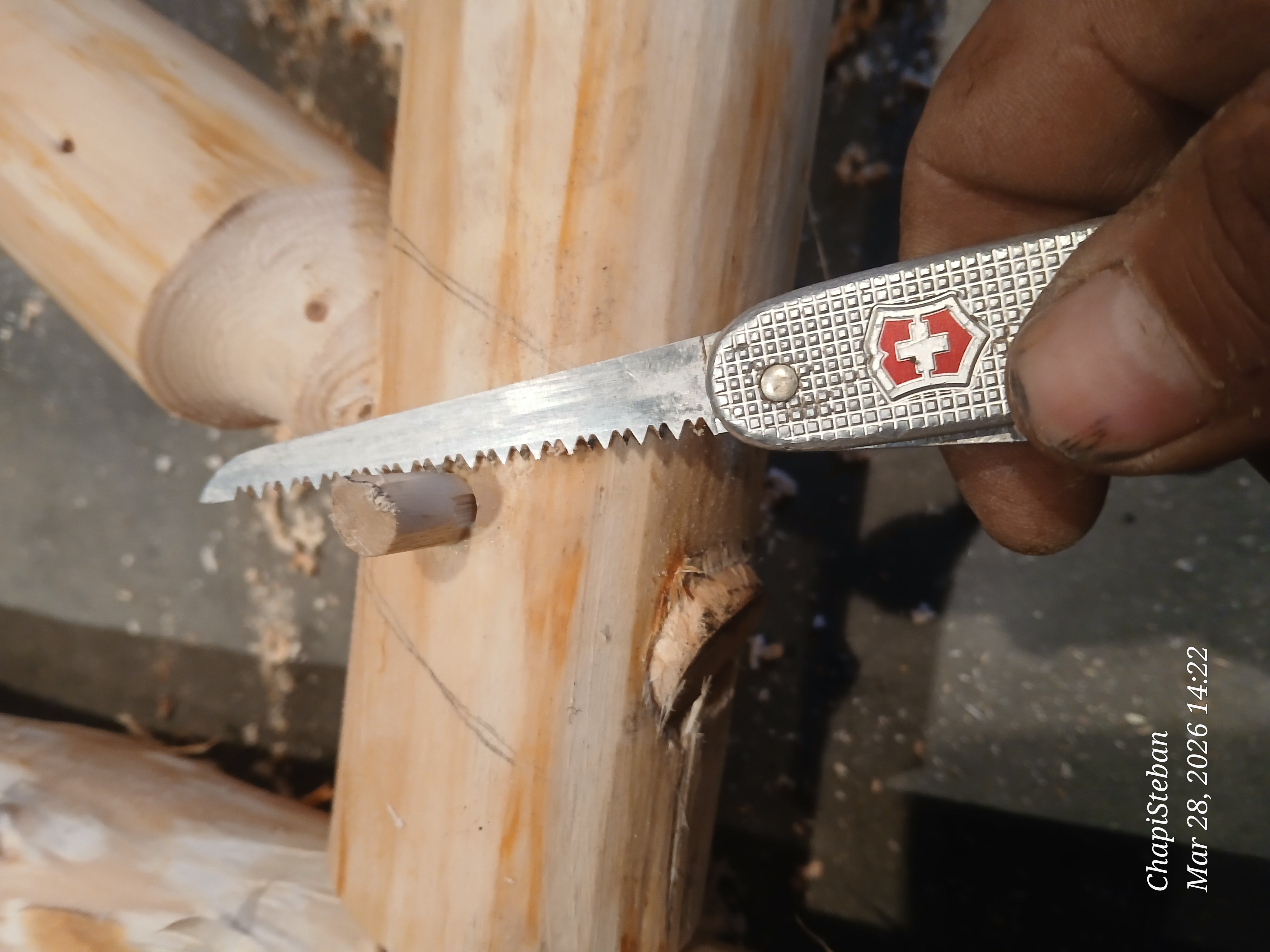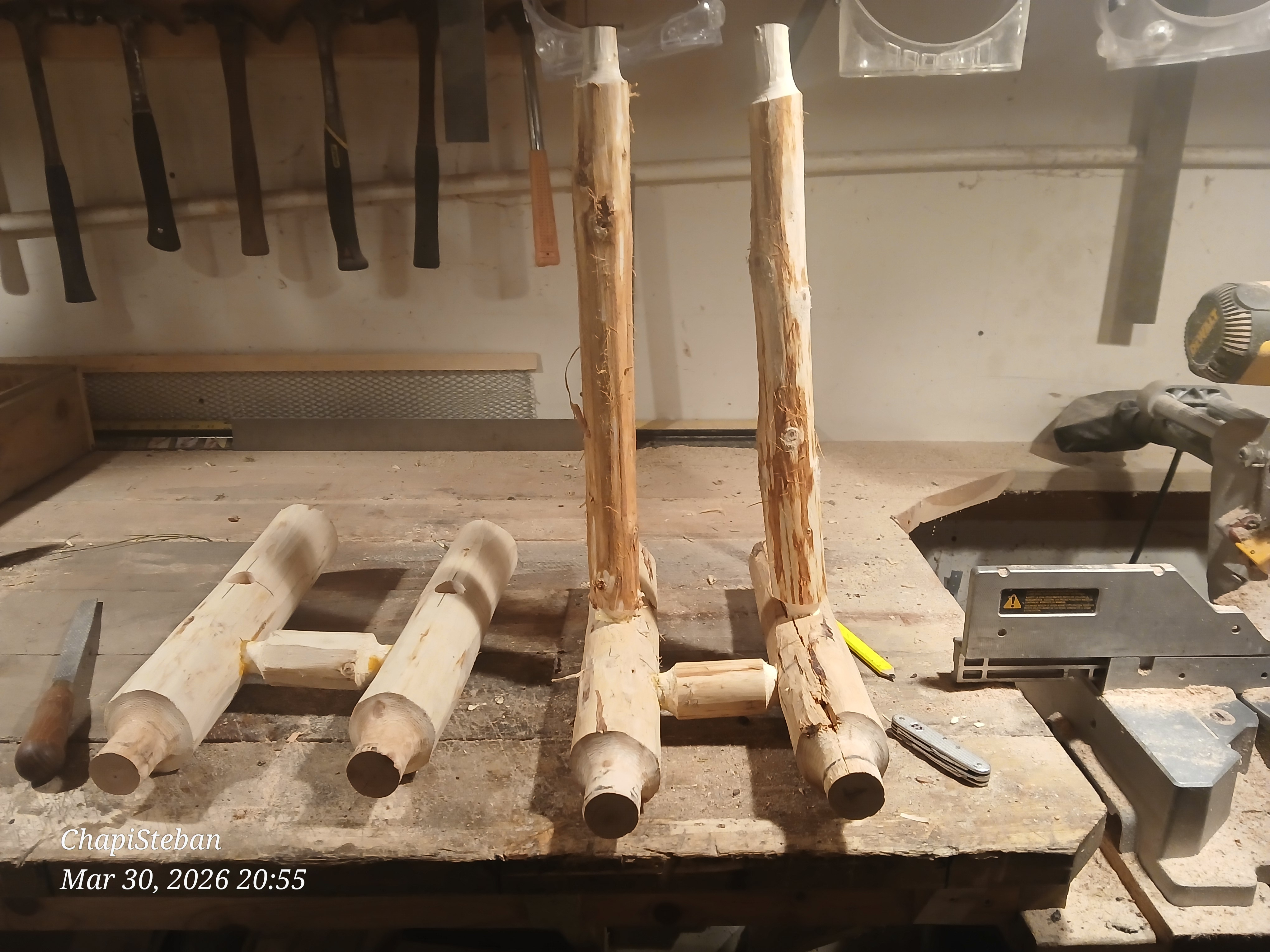 So far, I’ve completed a roundwood stool and an end table, and more recently, worked alongside fellow Boots to build a garden gate from trees we harvested ourselves—using mortise and tenon joinery, drawboring, no metal fasteners, and no glue.