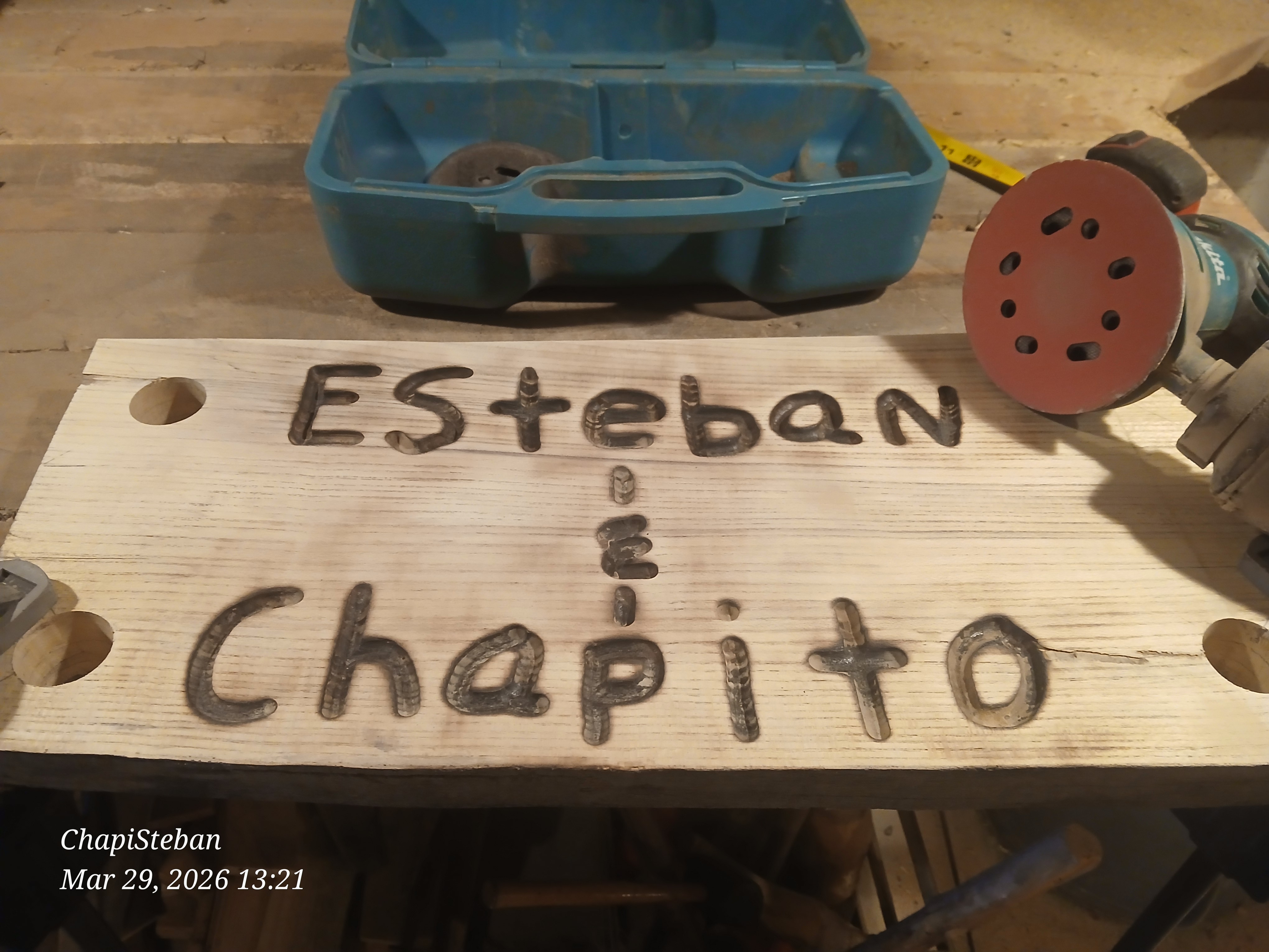 Once that wrapped up, I drifted back into the shop and picked up where I left off on the coffee table. This part felt a bit more personal. I grabbed the router and carved my name—and Chapito’s—into the surface. After that, I torched the lettering to blacken it, then sanded everything down smooth. The contrast came out really nice—simple, but meaningful.