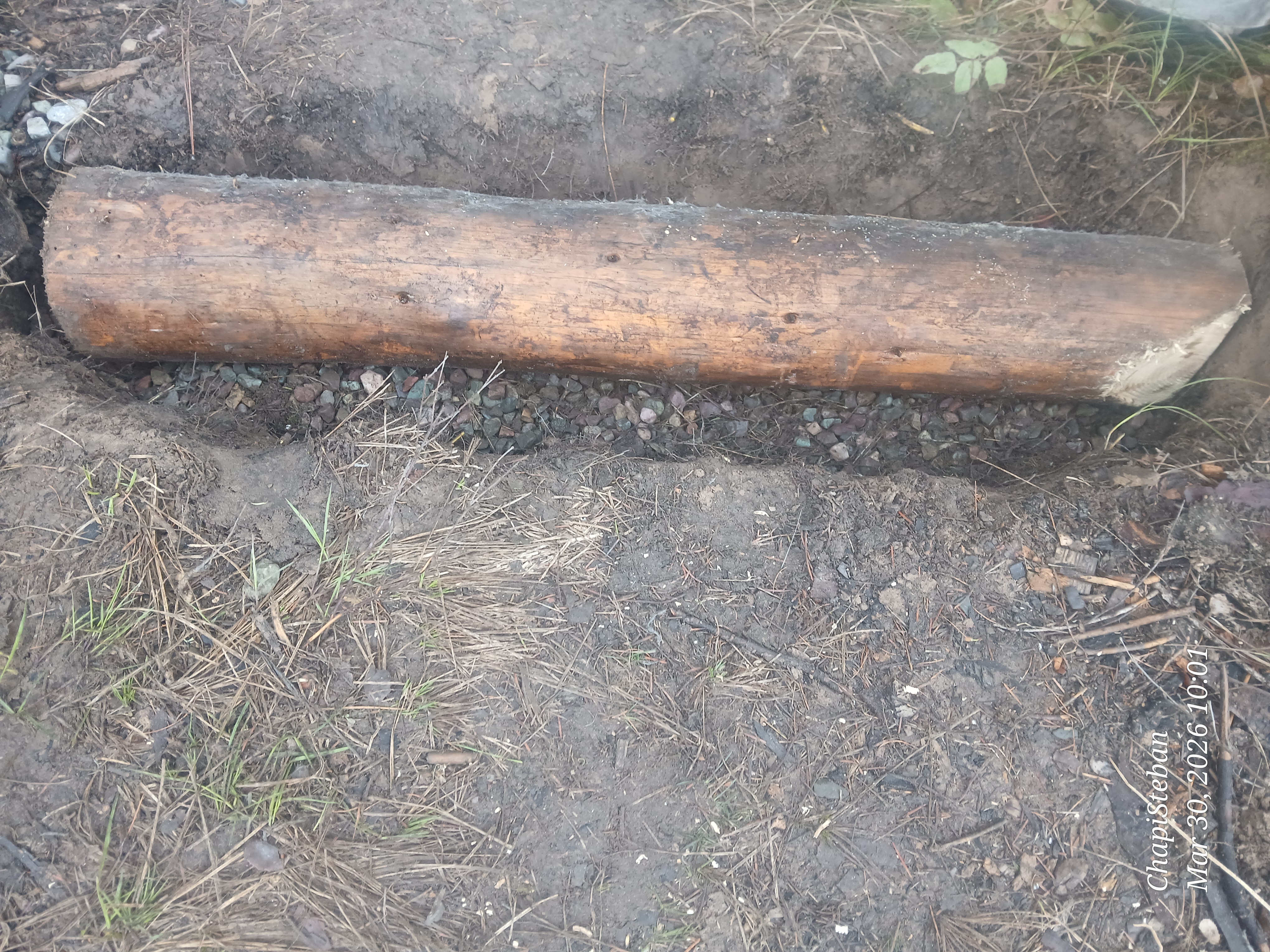 After staging the log on top of the gravel foundation, we backfilled the hole with more gravel, using the gravel sock method to promote drainage and stability. We then removed the top piece that had been fastened between the two posts—right about the time lunch rolled around.
