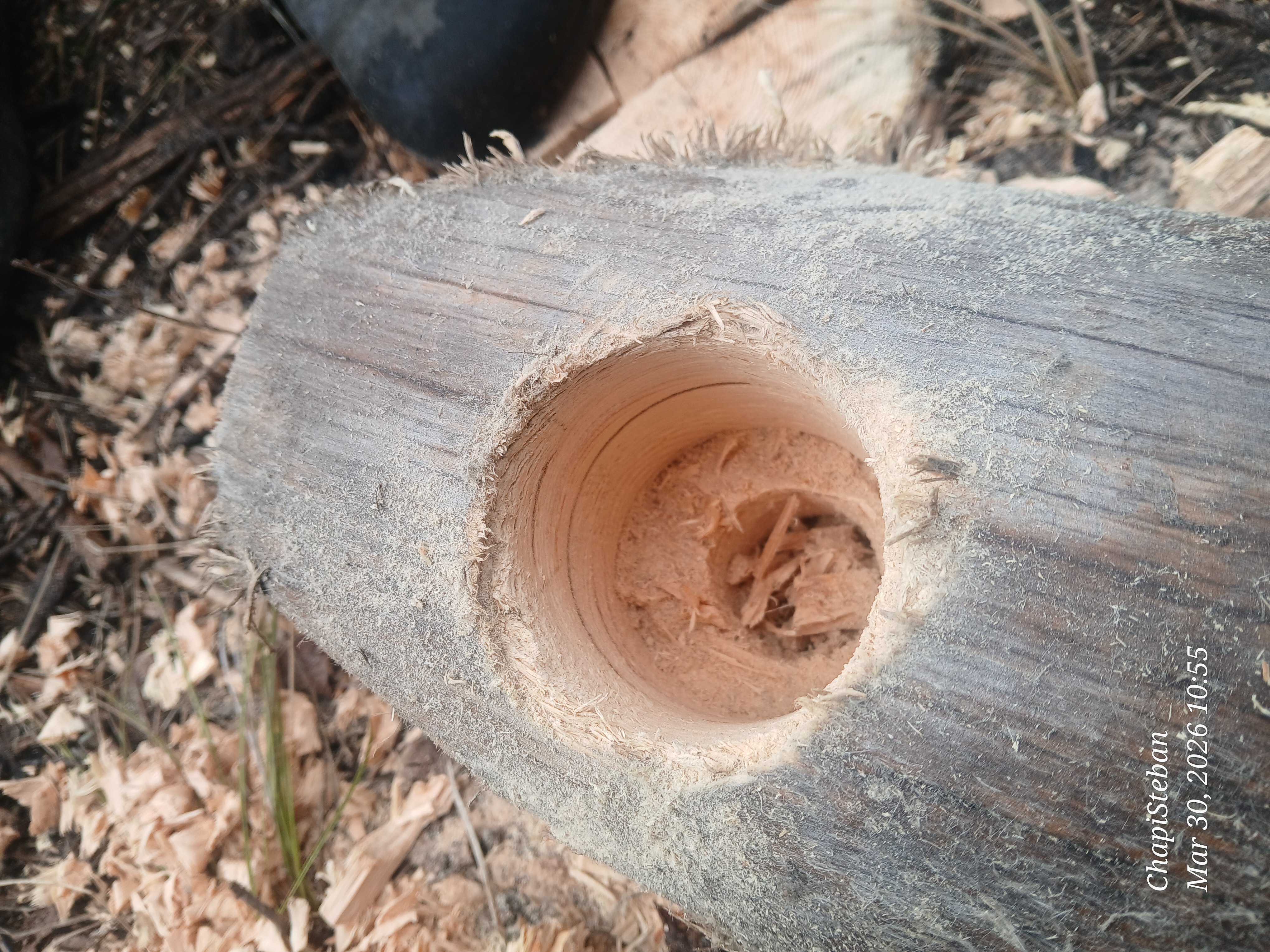 Once on site, Seth and I got to work. The first order of business was removing the old gate and digging out a hole between the two vertical support posts. With the space prepped, we laid down about 3 inches of gravel to create a solid drainage base. From there, we cut a log to size for the footer, drilling a hole for the hinge—but we didn’t stop there. We drilled all the way through the log to allow drainage above the hinge, a small detail that should go a long way in extending the life of the setup.